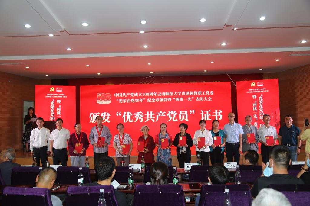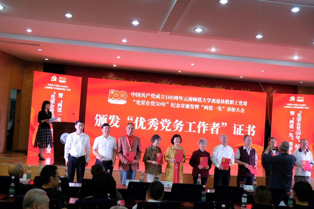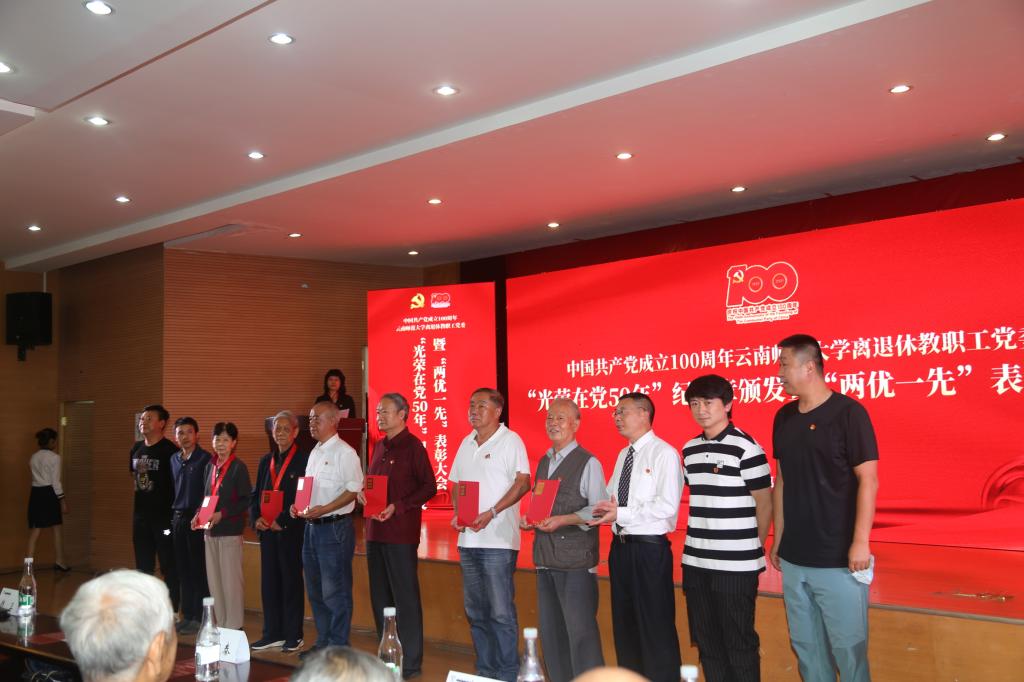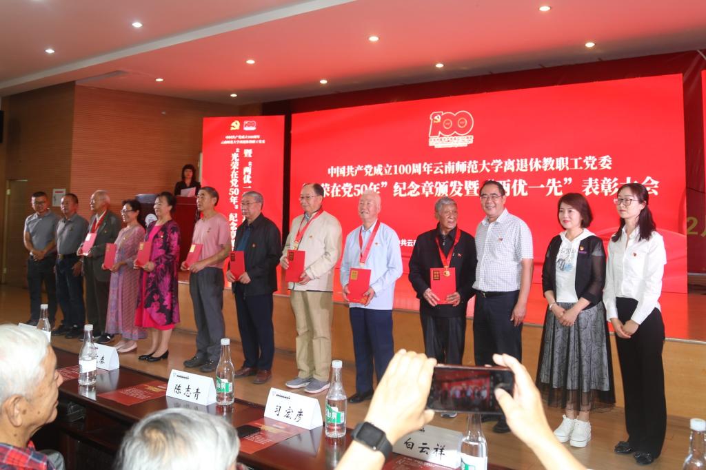 随后,校党委书记饶卫、云南省老干部党校校长魏晓冬、校党委副书记张玮等领导为到场获得中共中央“光荣在党50年”纪念章的每一位党员颁发纪念章,为获得校党委表彰的先进党支部、优秀共产党员、优秀党务工作者颁发奖牌和荣誉证书。离退休工作领导小组成员单位负责人为获得离退休教职工党委表彰的先进党支部、优秀共产党员、优秀党务工作者颁发奖牌和荣誉证书。