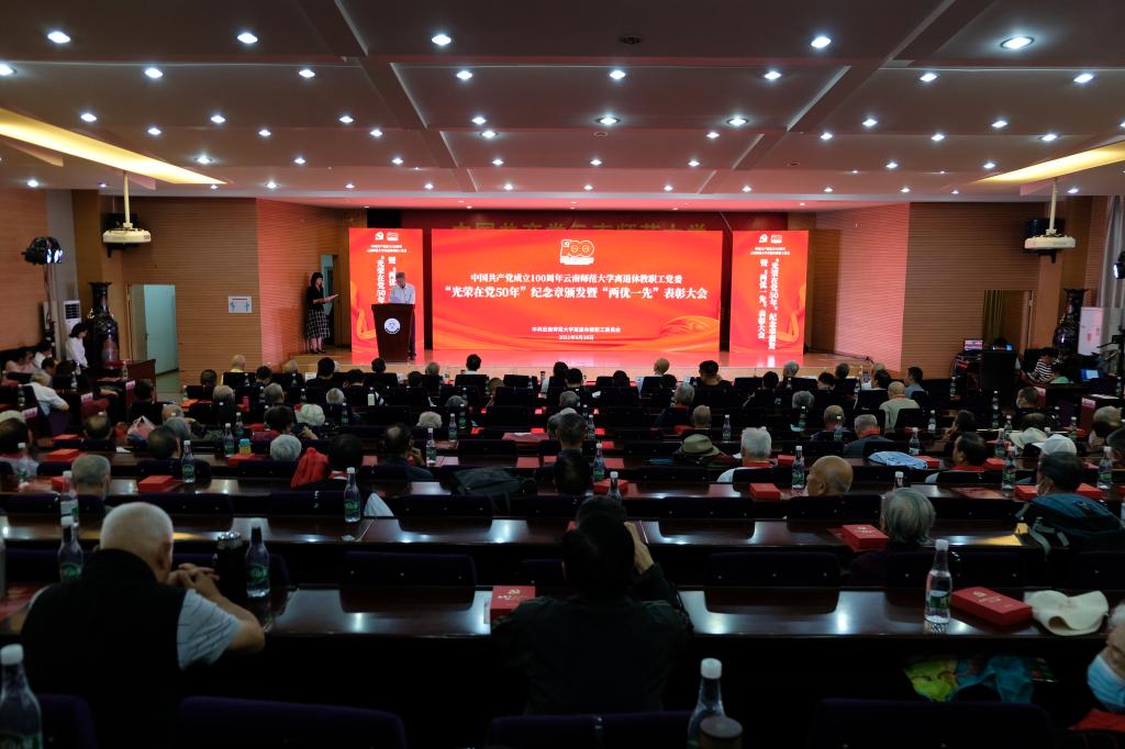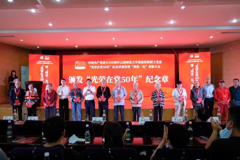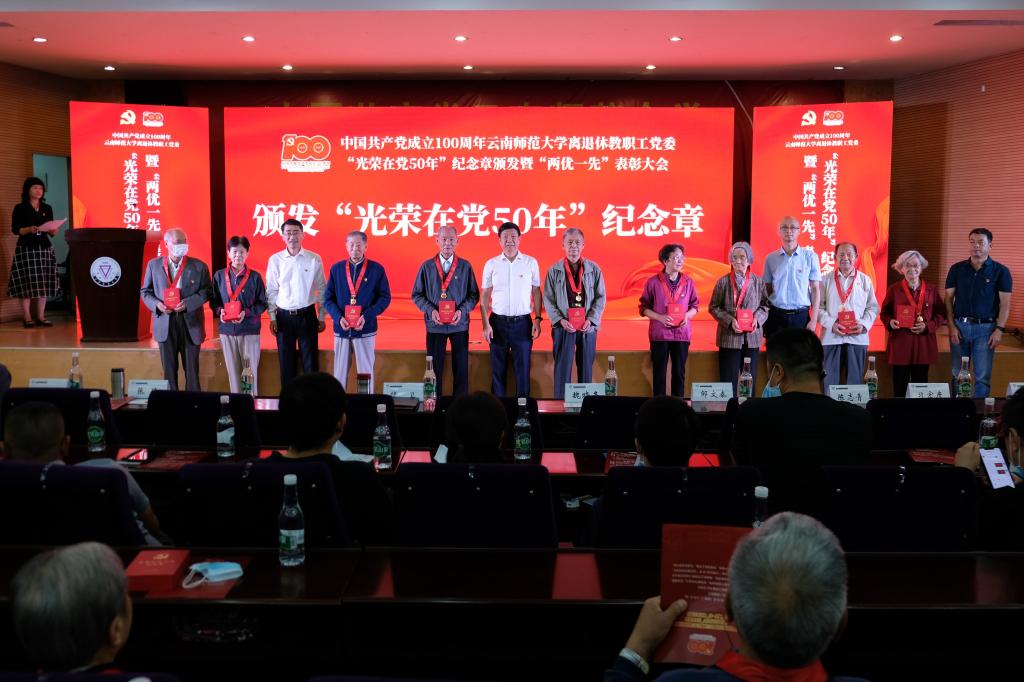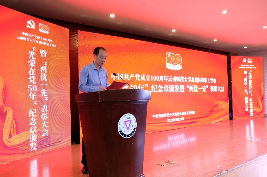 2021年6月28日上午,离退休教职工党委在西南联大校区田家炳教育书院二楼报告厅举行中国共产党成立100周年437必赢会员中心离退休教职工党委“光荣在党50年”纪念章颁发暨“两优一先”表彰大会。校党委书记饶卫、云南省老干部党校校长魏晓冬、校党委副书记张玮,学校离退休老领导,离退休工作领导小组成员单位及联大校区相关单位负责人,获得中共中央“光荣在党50年”纪念章的党员同志,受表彰的优秀共产党员、优秀党务工作者、先进党支部及离退休教职工党员代表等150余人参加会议。表彰大会由离退休教职工党委书记王琼玲同志主持。