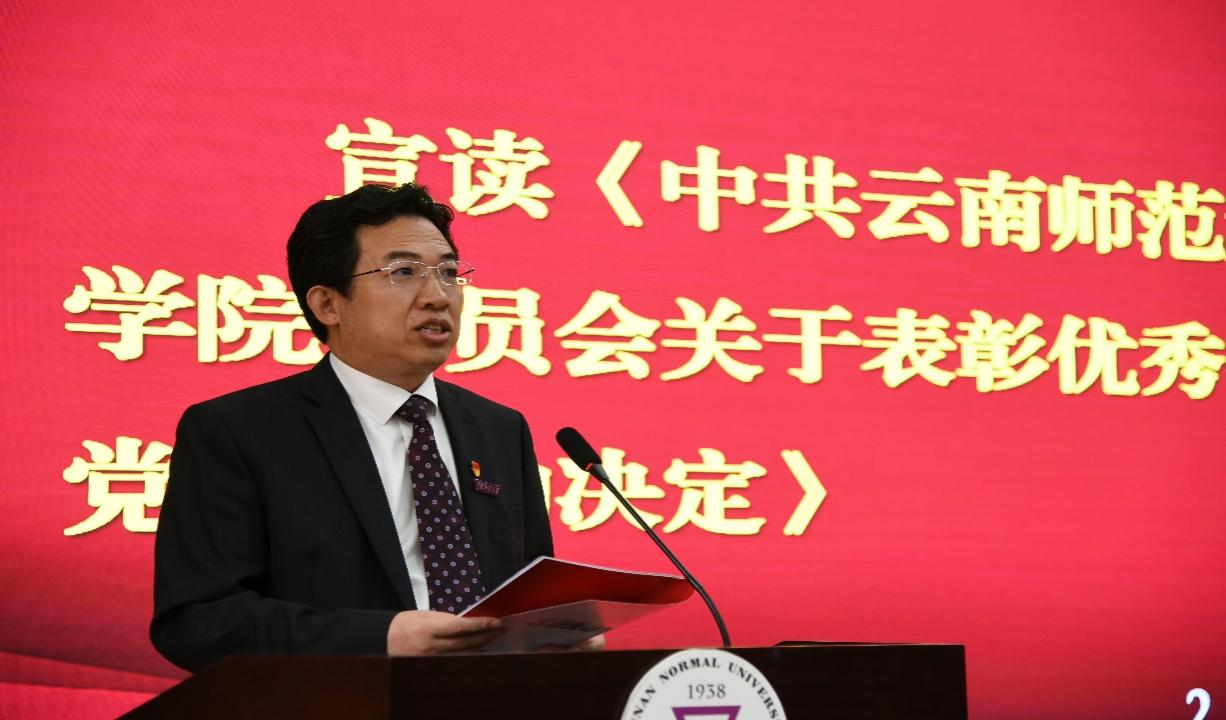学院党委委员、学院院长王秀成同志宣读了《中共437必赢会员中心云南华文学院、国际汉语教育学院委员会关于表彰优秀共产党员、优秀党务工作者、先进党支部的决定》。学院有1名党员被表彰为云南省学校优秀共产党员;有5名党员被表彰为学校优秀共产党员、1名党员被表彰为学校优秀党务工作者、2个党支部被表彰为学校先进基层党组织。学院党委表彰了10名优秀共产党员、2名优秀党务工作者、1个先进党支部。