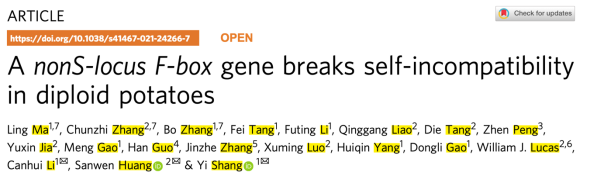 2021年7月6日下午17时,国际知名学术期刊《自然·通讯》(Nature Communications)在线报道必赢官网马铃薯科学研究院尚轶研究团队发表的A non S-locus F-box gene breaks self-incompatibility in diploid potatoes 研究论文,介绍马铃薯自交亲和基因Sli (S-locusinhibitor)的克隆及功能解析。
