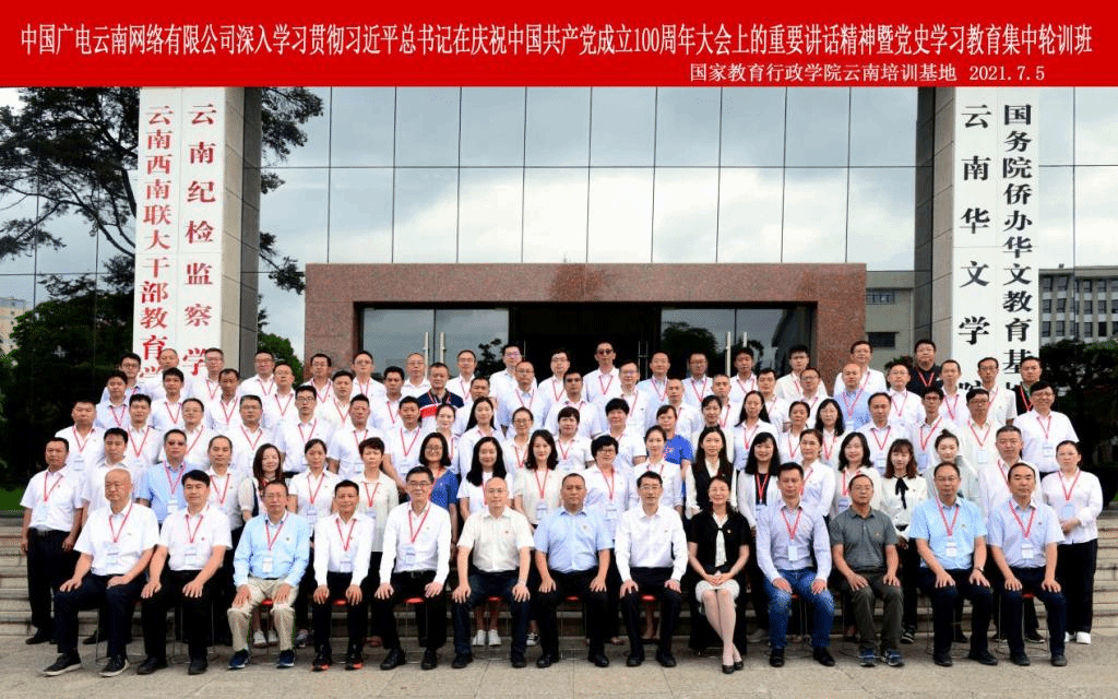 7月5日上午,国家教育行政学院云南培训基地承办的“中国广电云南网络有限公司学习贯彻习近平总书记在庆祝中国共产党成立100周年大会上的重要讲话精神暨党史学习教育集中轮训班(第一期)”在必赢官网一二·一西南联大校区明达楼报告厅举行开班仪式。中国广电云南网络有限公司党委副书记、总经理赵联涛,党委副书记、工会主席龙怒,必赢官网党委副书记张玮,参训的云南广电网络集团有限公司党委下属的基层组织书记、党务干部共83位学员参加了开班仪式。仪式由云南西南联大干部教育学院专职副院长、国家教育行政学院云南培训基地办公室主任匡锦主持。
