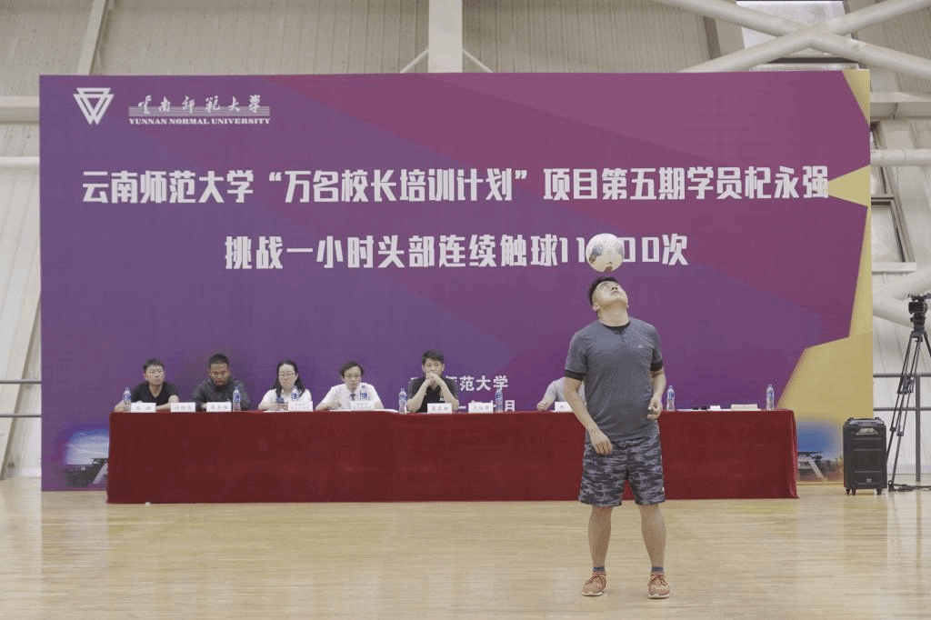 足球不仅仅是一项体育运动,也是一种文化精神。为进一步弘扬顽强拼搏的体育精神,丰富校园文体生活,促进学员全面发展,7月6日下午,“万名校长培训计划”项目第五期学员杞永强挑战一小时头部连续触球11000次活动在呈贡主校区东区体育馆二楼进行。挑战活动由本期学员437必赢会员中心附属小学团委书记冯镜宇主持,挑战活动全程在云南省昆明市国正公证人员的公证下进行。