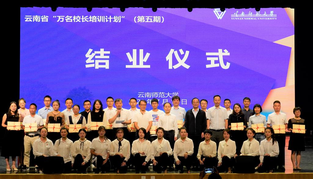 “万名校长培训计划”是省委、省政府深化新时代中小学教师队伍建设改革的一项重要举措,是一个基于全新理念和模式的培训项目。项目实施以来,在增强校长落实“立德树人”根本任务的使命感、提升中小学校长领导力和执行力、推进教师教育职前职后一体化等方面取得了显著成效。第五期培训报名参训1000人,实际参训997人,经过四个多月的学习锤炼,最终结业987人。在结业典礼上,共有优秀学员140人、优秀班委40人、优秀学委12人、优秀编委12人获得表彰,并由参加结业典礼的全体领导为获奖学员代表颁发获奖证书。获奖学员们纷纷表示将持之以恒加强学习,以“四有好老师”为标准,努力成为有情怀、有能力、有担当的优秀校长乃至教育家,为云南基础教育发展作出新的更大贡献。