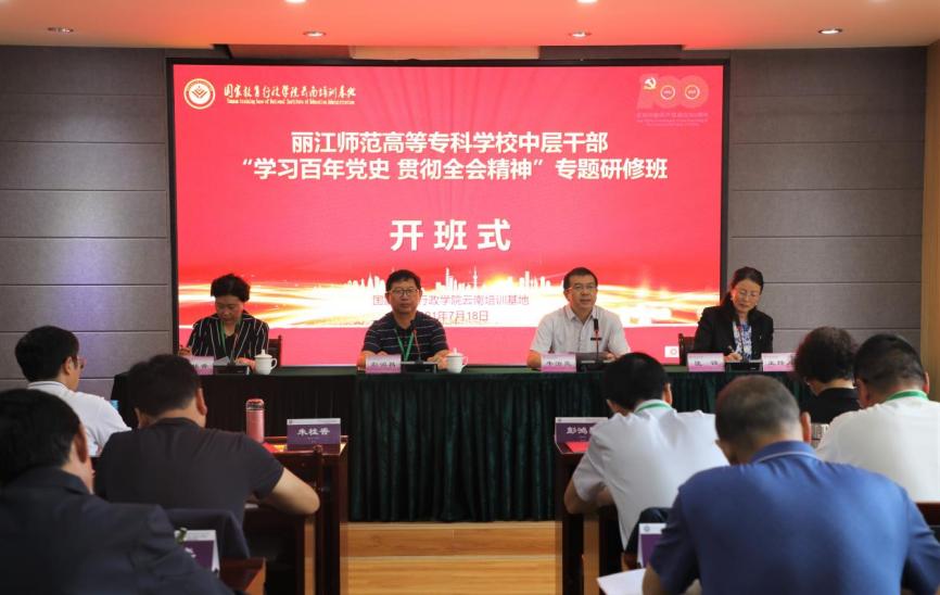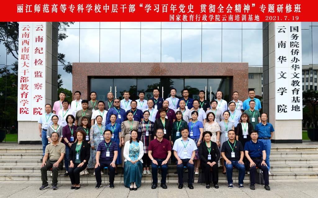 7月18日至22日,丽江师范高等专科学校中层干部“学习百年党史 贯彻全会精神”专题研修班在必赢官网一二一联大校区举办,由国家教育行政学院云南培训基地承办。丽江师范高等专科学校党委书记张祖武、校长毕天云带队,全校中层以上干部共51人参加。丽江师范高等专科学校党委副书记彭鸿昌、副校长朱桂香、437必赢会员中心副校长牛治亮参加开班仪式,仪式由云南西南联大干部教育学院专职副院长、国家教育行政学院云南培训基地办公室主任匡锦主持。