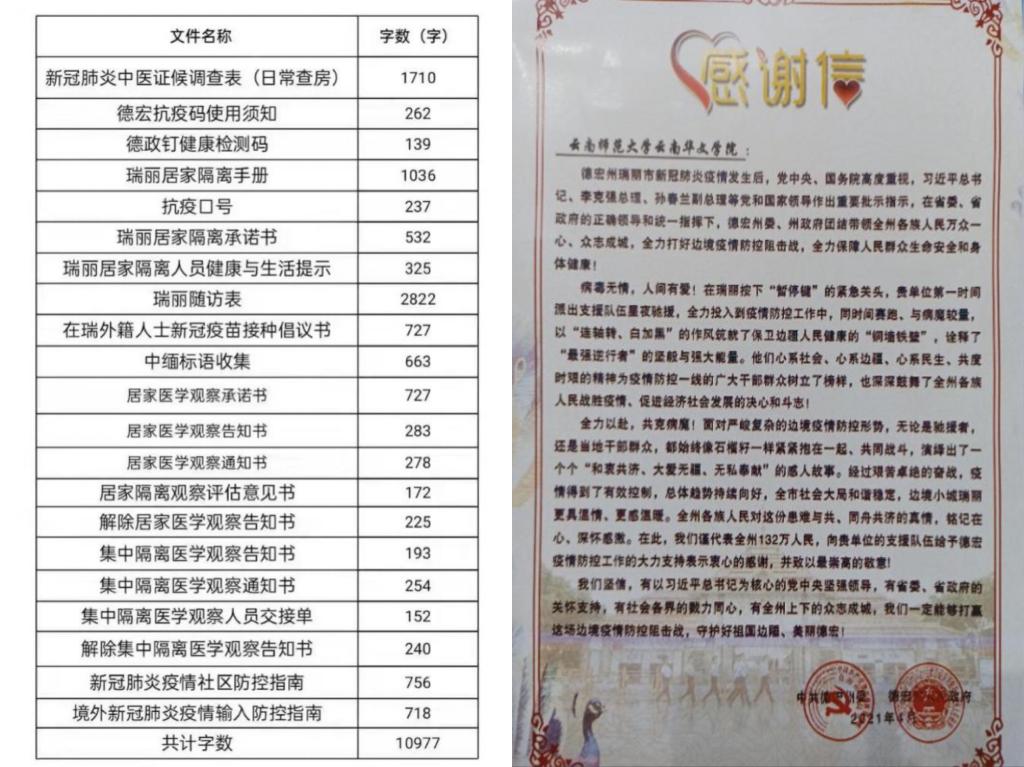 各志愿者按要求完成所分配到的相关任务,在指导老师带队下,团队每天完成疫情相关文件的翻译,并将翻译稿件制作为音频、视频,为疫区一线及时提供疫情防控宣传资料,云师瑞丽抗疫志愿者团队共翻译文件20份,总字数达10977字,整理出来的疫情词汇共计1400字。翻译后的文件根据需要被用到瑞丽市人民医院、瑞丽市中医傣医医院、瑞丽市景成医院、瑞丽市勐卯镇卫生院疫苗接种点、瑞丽市方舱医院以及瑞丽市个社区疫苗接种点。