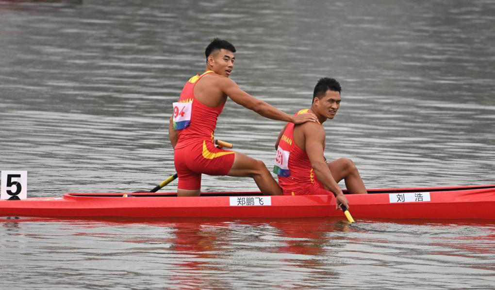 23日上午的半决赛在蒙蒙细雨中开桨,“浩飞”组合轻松应对,毫无悬念地以第一名晋级。1个小时后决赛开锣,刘浩和郑鹏飞完美出发,很快确立领先地位,并继续调整配速,拉开与其他艇的差距,500米时领先第二位的浙江队近两秒。比赛后程,刘浩和郑鹏飞按照自己的节奏稳扎稳打,最终“浩飞”组合以3分35秒185轻松夺冠。
