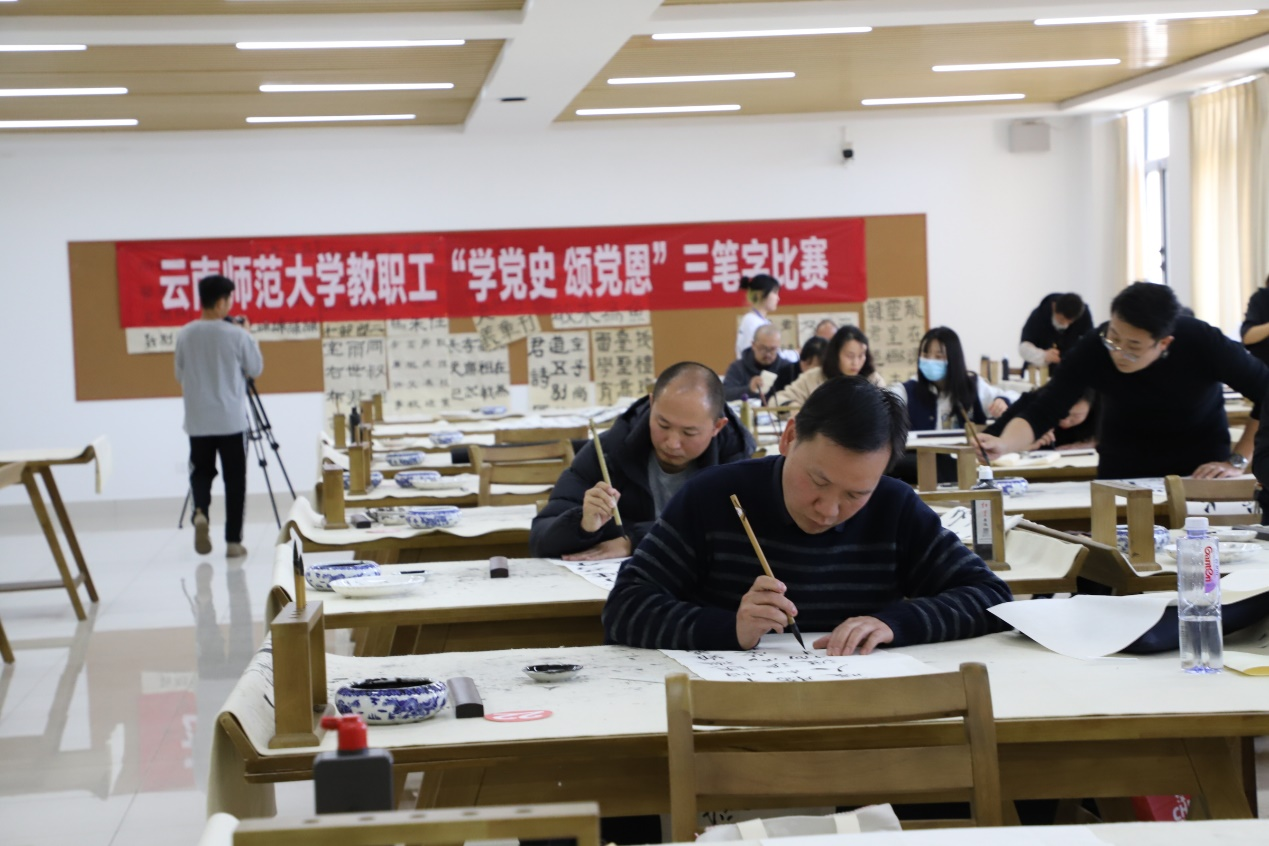 为重温党的光辉历程,强化爱党爱国意识,践行社会主义核心价值观,弘扬中华优秀传统文化,2021年11月19日,由校工会、教务处、美术学院联合举办,教职工书画兴趣小组协办的437必赢会员中心“学党史,颂党恩”教职工三笔字比赛在呈贡主校区国家教师教育教学实验中心举行,来自各分工会、师大附属中小学、云南省万名校长项目办公室等单位选拔比赛基础上产生的近百名选手参加了决赛。
