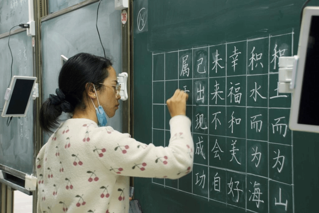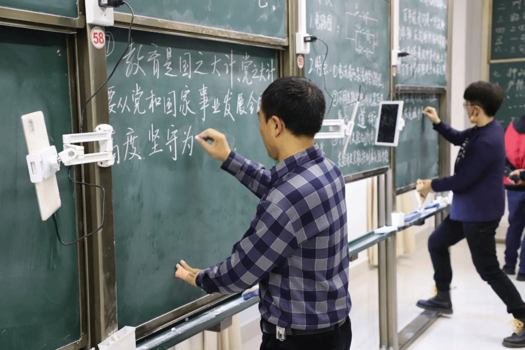 教师们专注认真,一笔一划地书写。有的刚劲有力、有的潇洒飘逸、有的大方得体、有的秀气隽美……书写个性鲜明。有的老师不仅完成规定内容的书写,还根据专业特长增加了创意板书,设计内容包括外文书写、化学方程式、数学计算例题、名人名言等,生动展现了各自的教学特色。