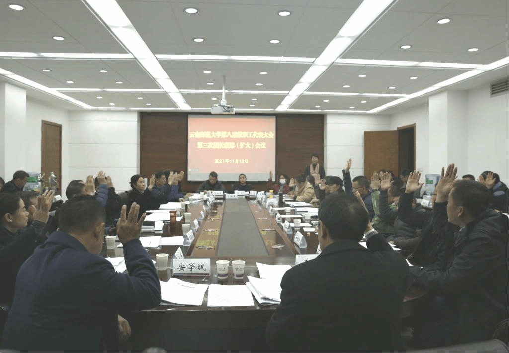 437必赢会员中心第八届教职工代表大会第三次代表团团长联席(扩大)会议于2021年11月12日在呈贡主校区召开。校党委副书记、工会主席张玮,副校长安学斌,以及学校第八届教代会暨第十五届工代会各代表团团长和副团长、学校第八届教代会各专门委员会主任和副主任、学校第十五届工会委员会委员、分工会主席、文理科学院(学部)代表、直属单位代表、教辅单位代表出席了会议,会议由校工会常务副主席金黄斌主持。