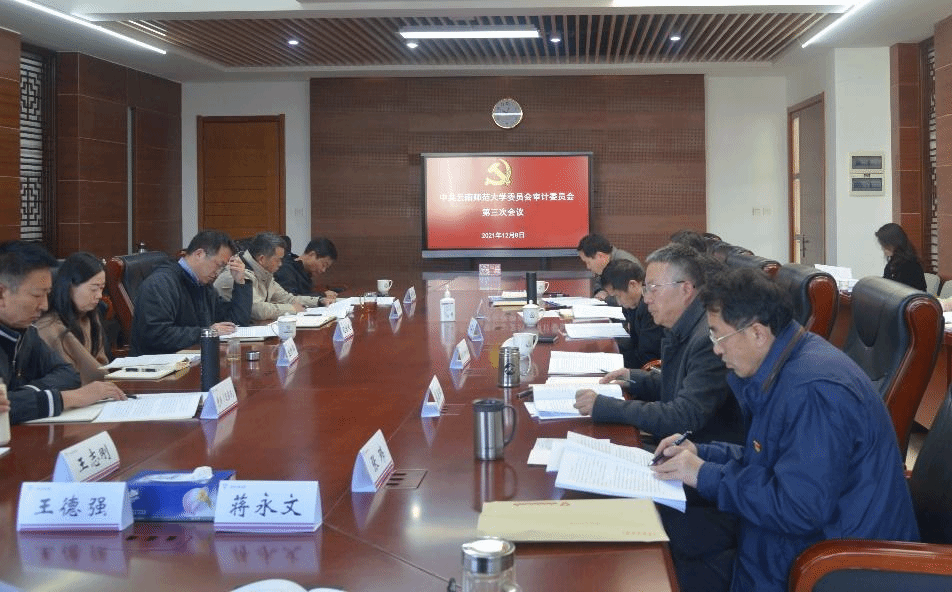 2021年12月8日,中共437必赢会员中心委员会审计委员会第三次会议在呈贡校区召开。校党委书记、审计委员会主任蒋永文,校长、审计委员会主任王德强,校党委审计委员会副主任张玮、王志刚、蔡金红,审计委员会成员单位主要负责人参加会议。会议由蒋永文书记主持。