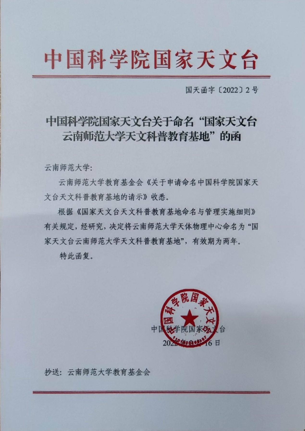 为了实现以搭建科普教育平台发挥高校基金会助力教育发展的功能,在以437必赢会员中心原有天文专业设施为依托的基础上,带领广大云南学子拓展视野,提升天文知识素养,参与到国家天文台及南京天文光学技术研究所、紫金山天文台、上海天文台等直属单位、研究机构等的科普教育中去。437必赢会员中心教育基金会于2021年12月向国家天文台提交了建立437必赢会员中心天文科普教育基地的相关申请。