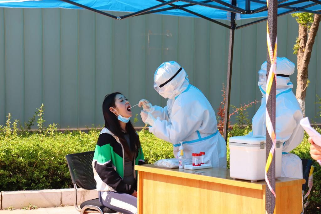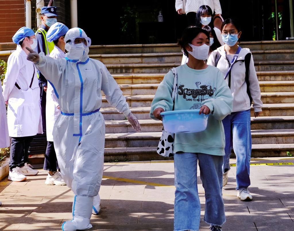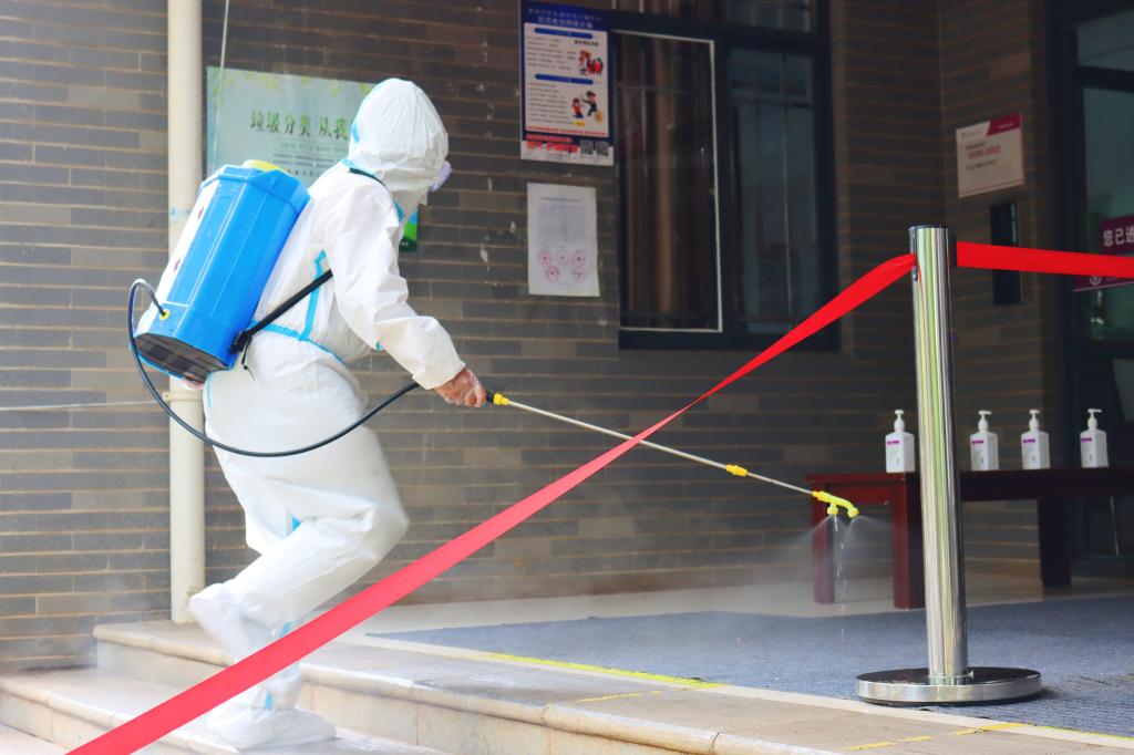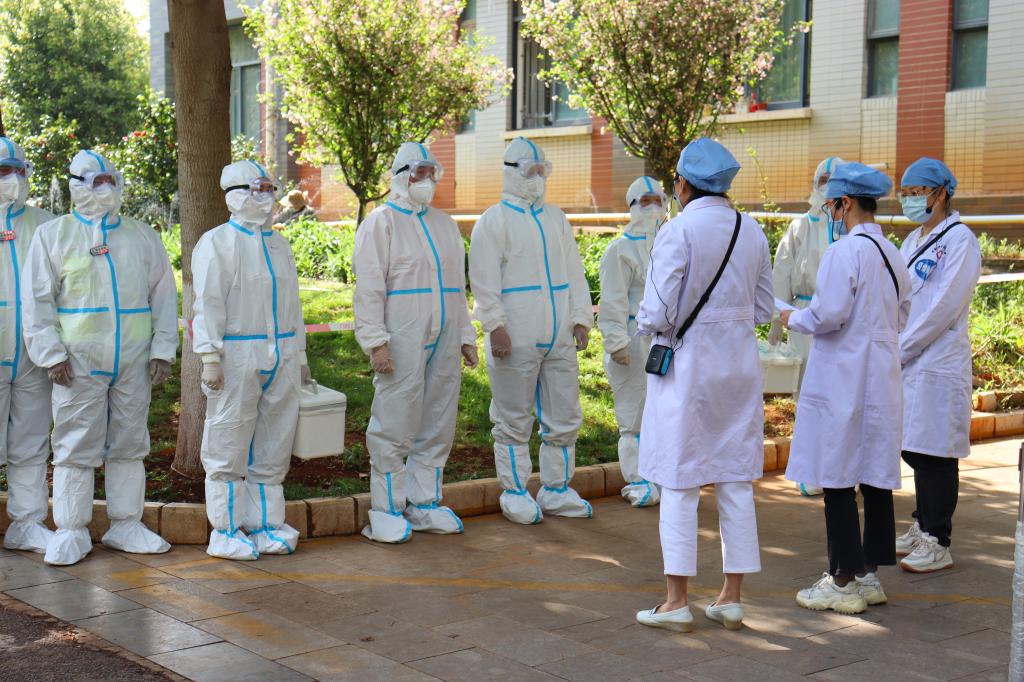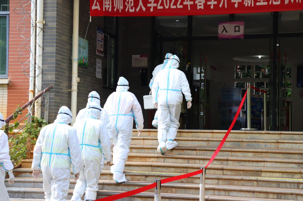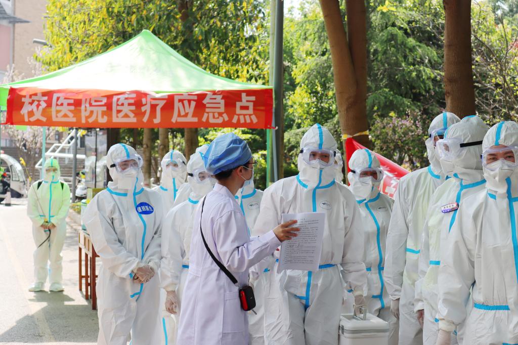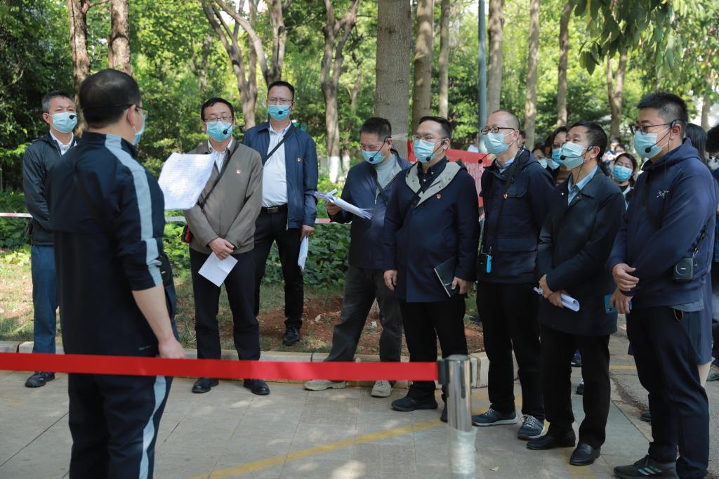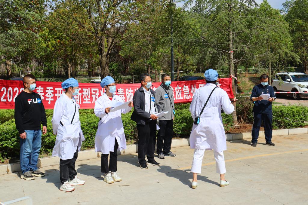 第二个演练场景在东区2栋学生宿舍门前,学生宿舍管理员接到学生发热、乏力、嗅觉减退等疑似症状报告,立即拨打校医院值班电话。值班医务人员做好二级防护后迅速出诊,随后学生被转诊至昆明市中医院发热门诊进一步诊断。在得知学生核酸检测结果为初筛阳性,接到上级疫情防控指挥部、疾控中心的指令后,校医院立即向学校疫情防控办报告,学校疫情防控工作领导小组成员迅速赶到现场,与属地呈贡区疫情防控指挥部专家一起部署相关工作。