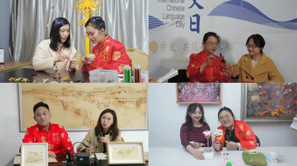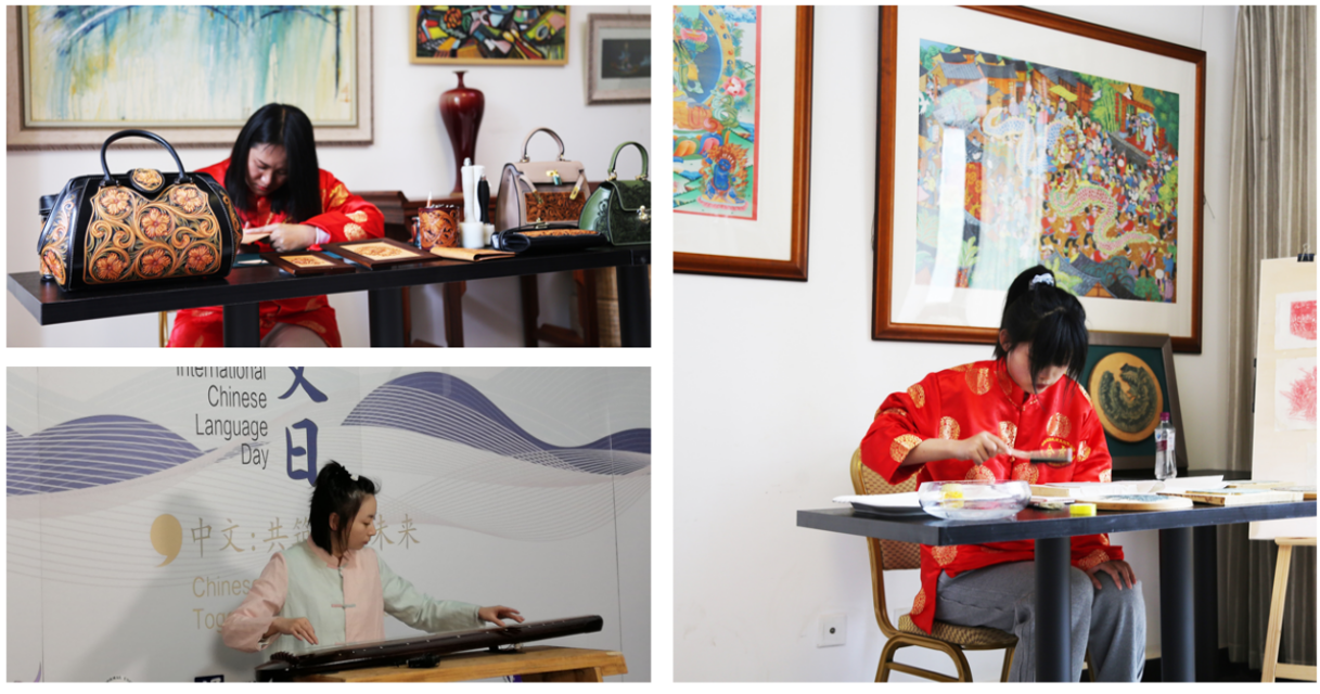 本次活动特别走进了昆明市非物质文化遗产保护传承基地——合虚民族民间文化传习馆,王华老师代表传习馆的艺术家们简要介绍了传习馆的历史和特色。为了契合今年“国际中文日”的主题,传习馆精心挑选出七项非物质文化遗产体验项目,既有大家熟悉的传统剪纸、面塑、古琴,还有别称“火笔画”的“烙画”、在皮革上雕刻纹样的“皮雕”、用丝线缠绕纸板和铜丝而成的“缠花”和在金石器物上完成图样复原的“传拓”。七种体验项目让大家进一步了解中国文化及非物质文化遗产的传承与保护。