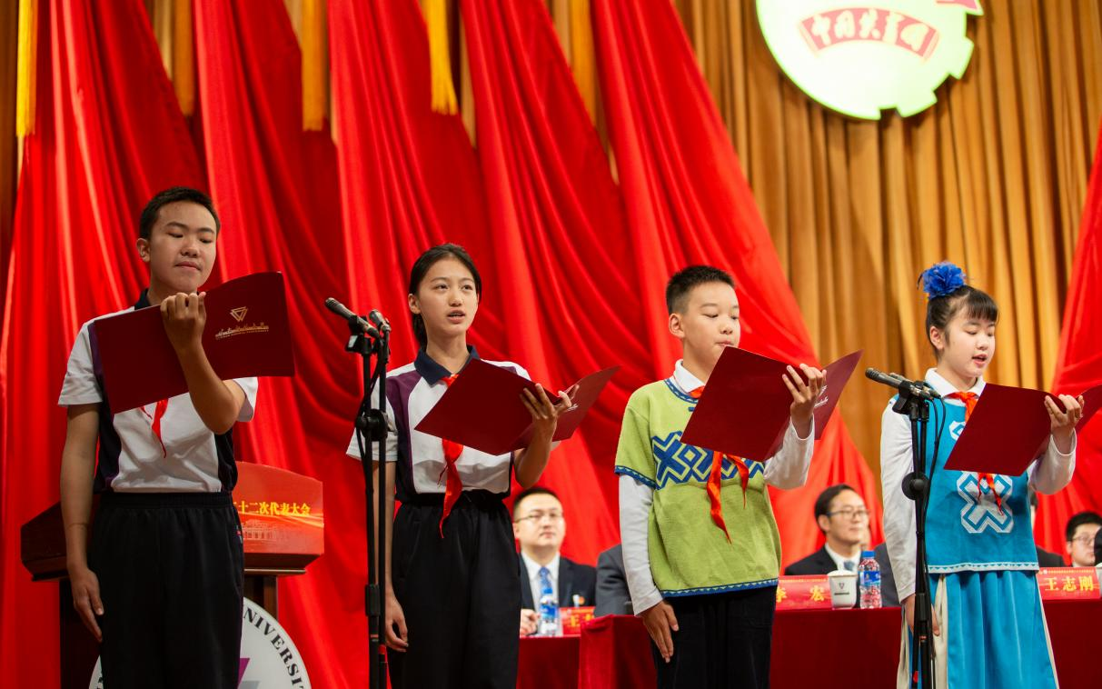 必赢官网附属中小学的少先队员代表在大会上献词。