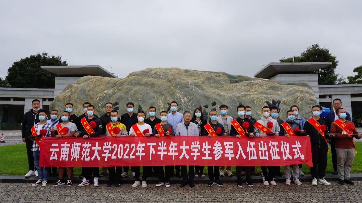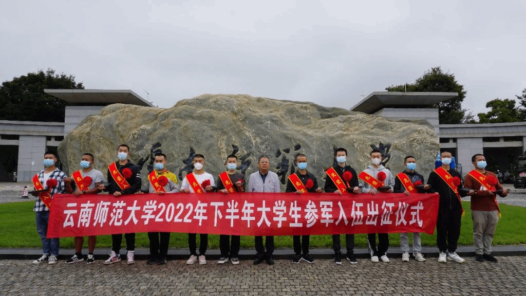 2022年9月1日下午,云南师范大学2022年下半年大学生新兵入伍出征仪式在呈贡校区1号门举行。副校长蔡金红,武装部、相关二级学院(学部)党委副书记,以及下半年由学校出发入伍的13名学生参加了出征仪式。出征仪式由武装部专职副部长兼任学生处副处长、学生工作部副部长李寿星主持。