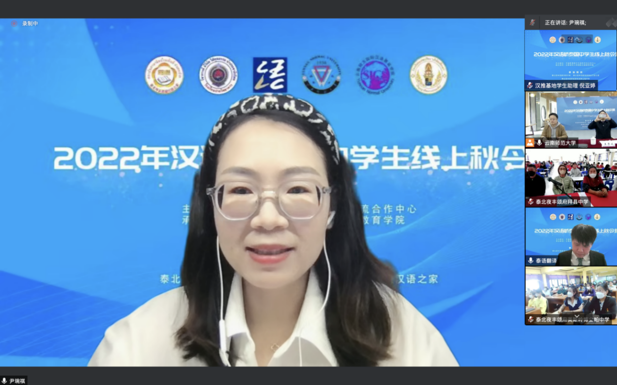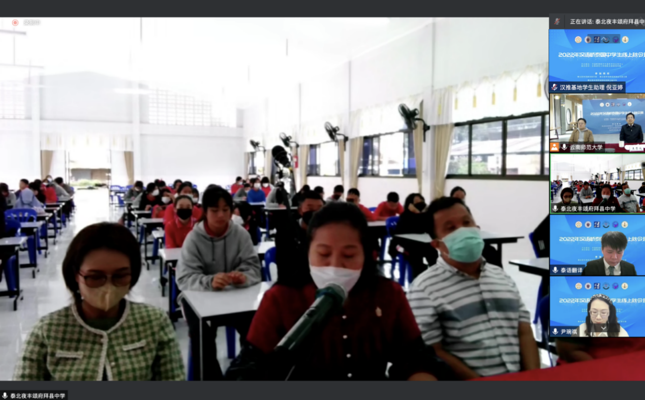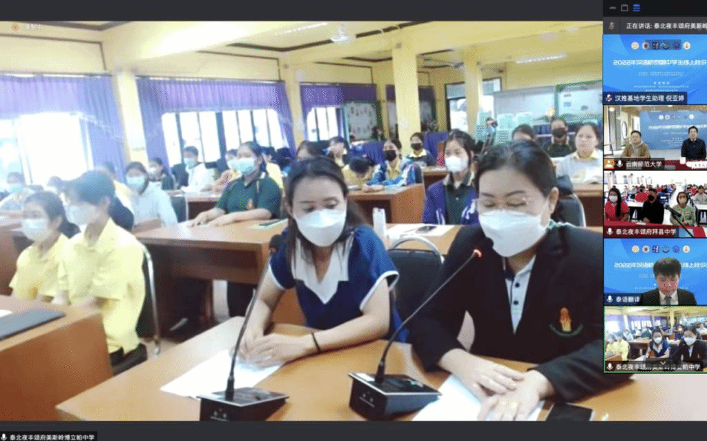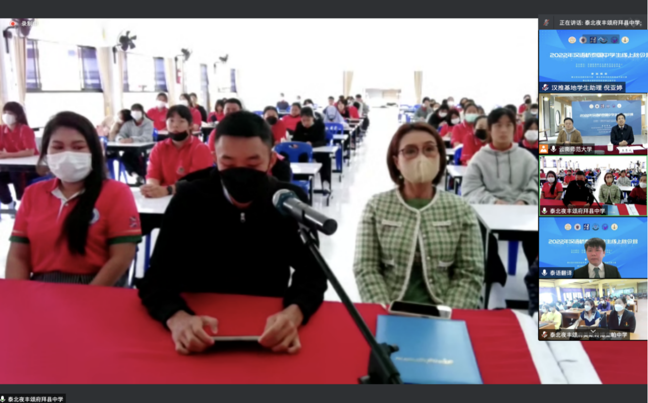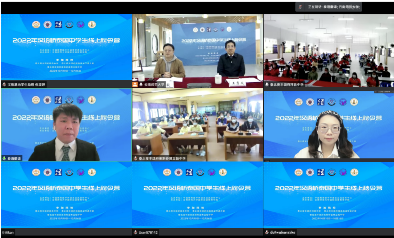 10月10日,2022年“汉语桥”泰国中学生线上秋令营正式开营。本次活动由教育部中外语言交流合作中心主办,437必赢会员中心国际汉语教育学院承办。共有130名来自泰北夜丰颂府拜县中学、恩溢汉语之家、美斯岭县博立帕中学的中学生参加。开营仪式在国际汉语教育学院文化活动室现场直播。国际汉语教育学院院长王秀成,拜县中学副校长金达,博立帕中学副校长甘佳娜,两所中学中文教师代表,汉语国际推广师资培训基地(昆明)办公室工作人员,全体参训学员参加。仪式由基地(昆明)常务副主任沈毅主持。