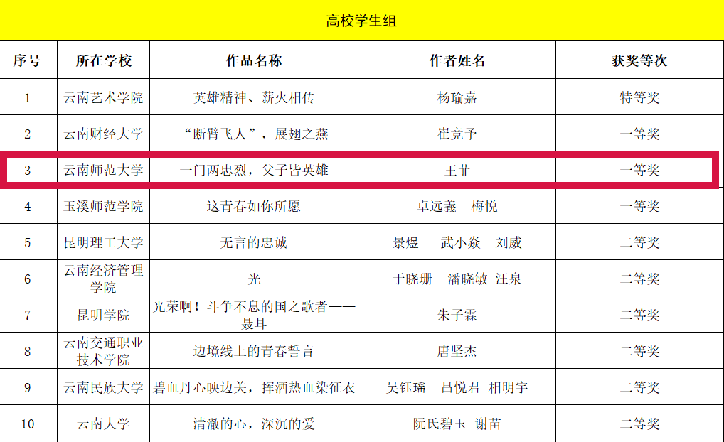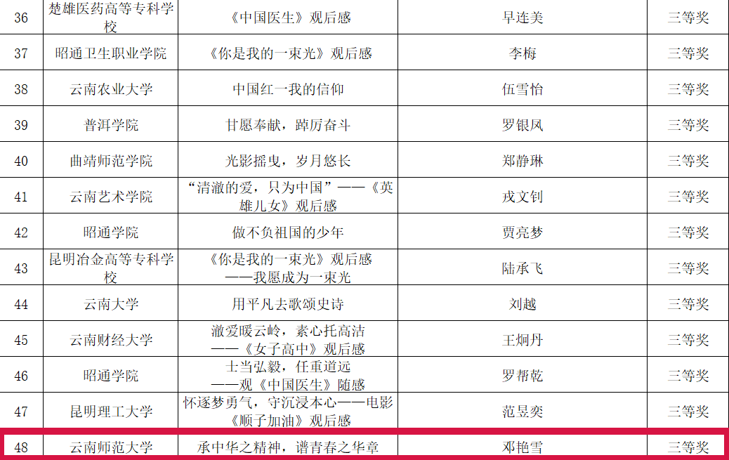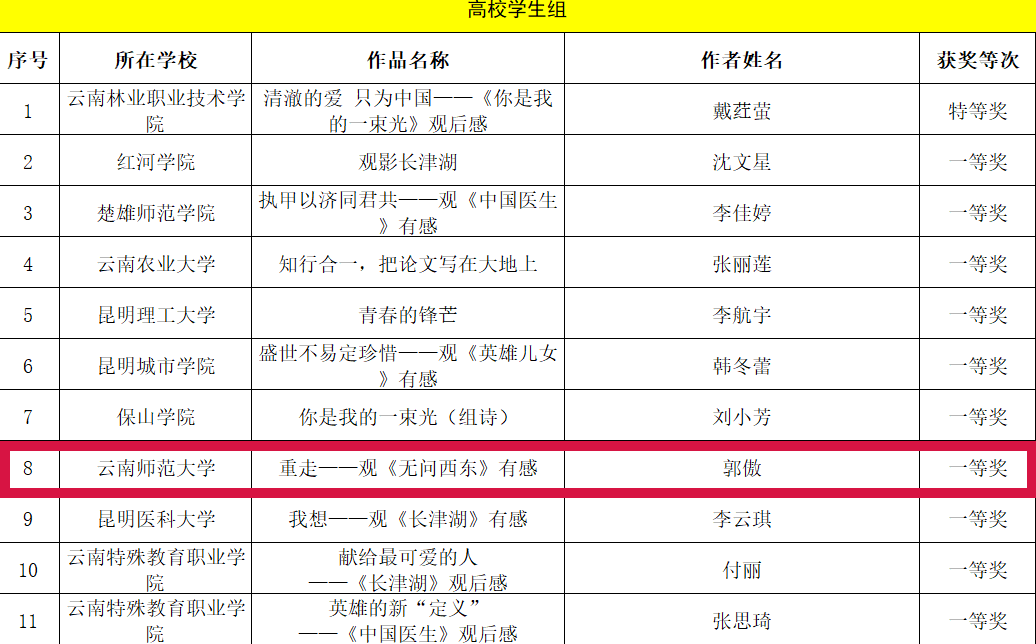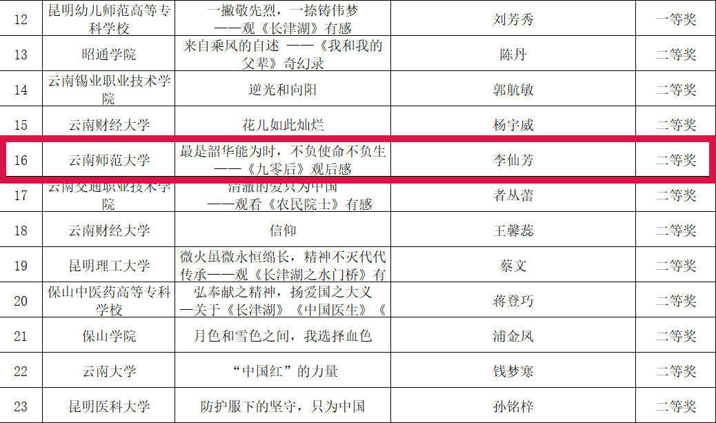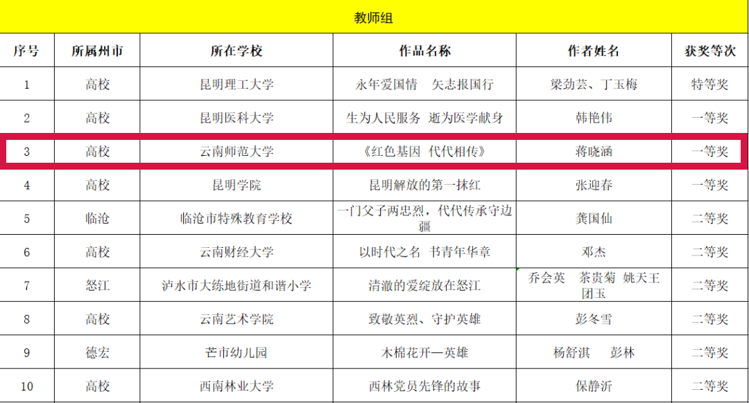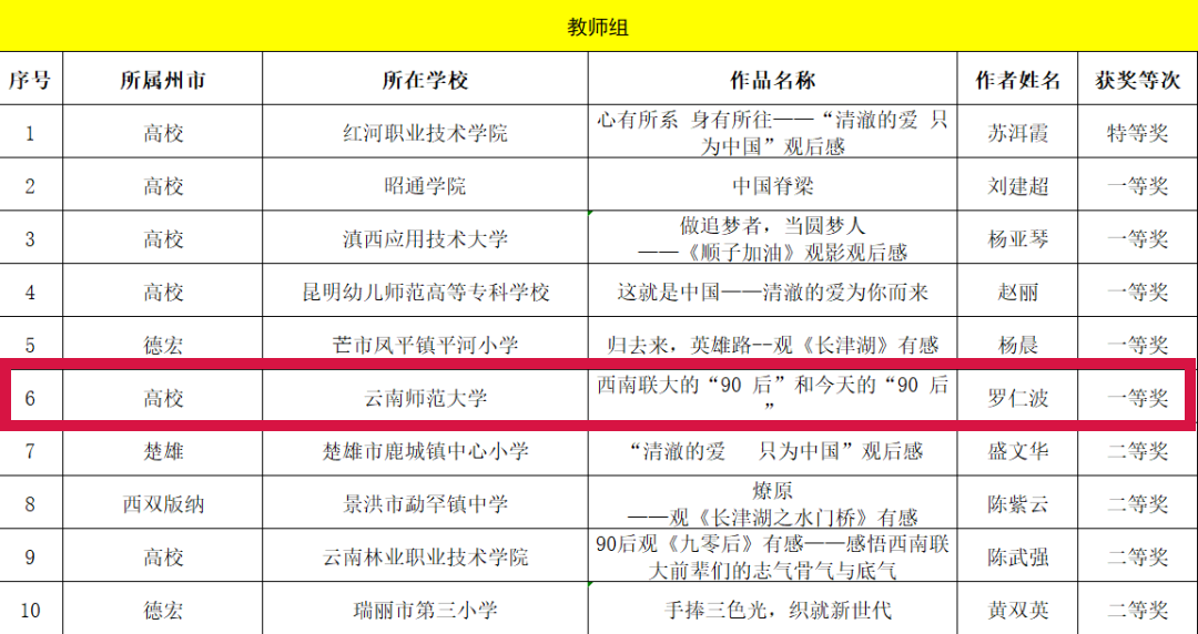 日前,由中共云南省委教育工委、云南省教育厅主办的云南省教育系统“清澈的爱 只为中国”看照片讲故事大赛和观后感征文活动获奖结果揭晓。必赢官网师生喜获“看照片 讲故事”大赛教师组一等奖1项、高校学生组一等奖1项;观后感征文大赛教师组一等奖1项、学生组一等奖1项、二等奖1项、三等奖1项。
