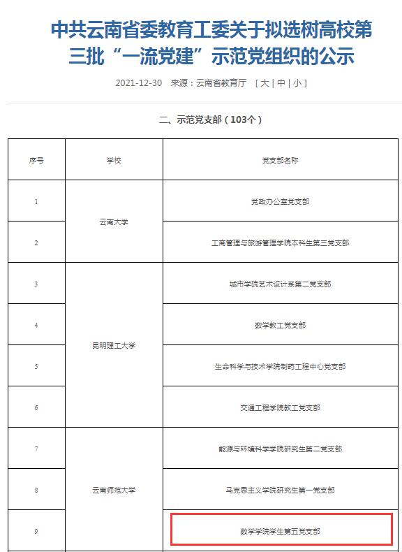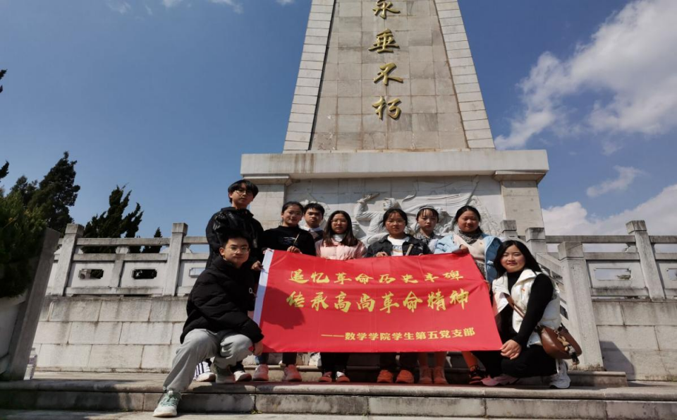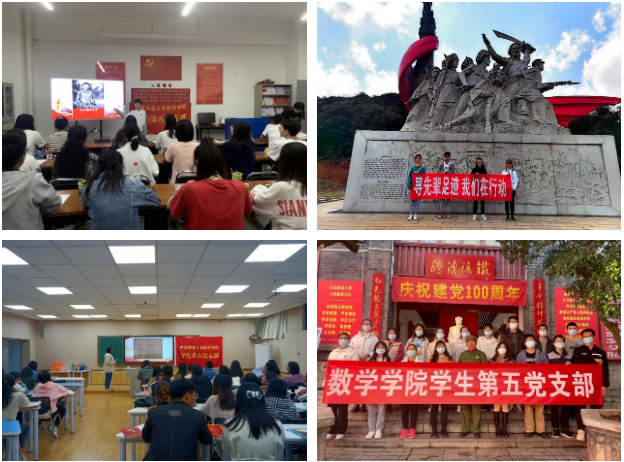 数学学院学生第五党支部由数学与应用数学公费师范生(一专多能、优师计划)组成,下设2个党小组,有党员41名。支部紧扣立德树人根本任务,对标“七个有力”,坚持“党建引领信仰之光,学思践悟、深学笃行”的思路,构建了“政治引领+信仰锤炼+榜样带动+师德培养+学风建设”五核驱动交互式学生党建创新机制。党支部获“教育部样板支部”“云南省第三批‘一流党建’示范党支部”“云南省委教育工委创建‘一流党建’支部典型工作法实地考察单位”,学校“优秀党支部”“创建一流党建示范党支部”“规范化达标示范项目”等荣誉。