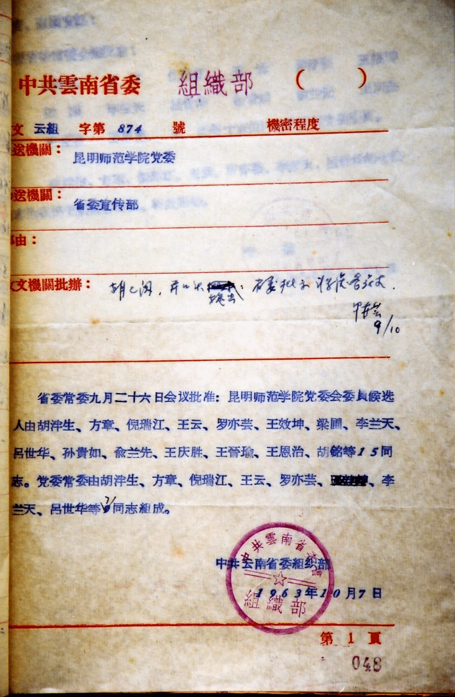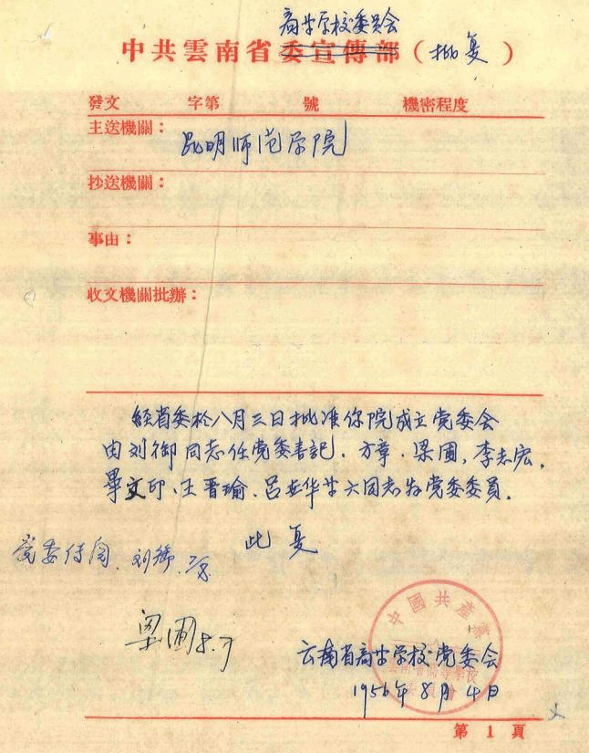 1956年8月4日,云南省高等学校党委会批准学校成立党委会,刘御同志任党委书记,方章等6人为党委委员。