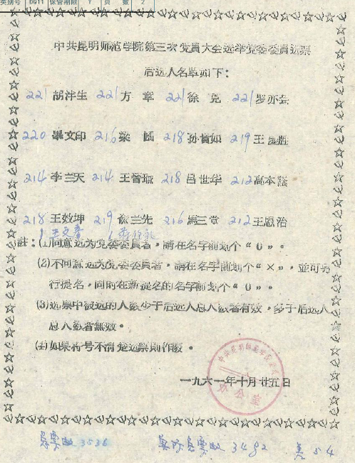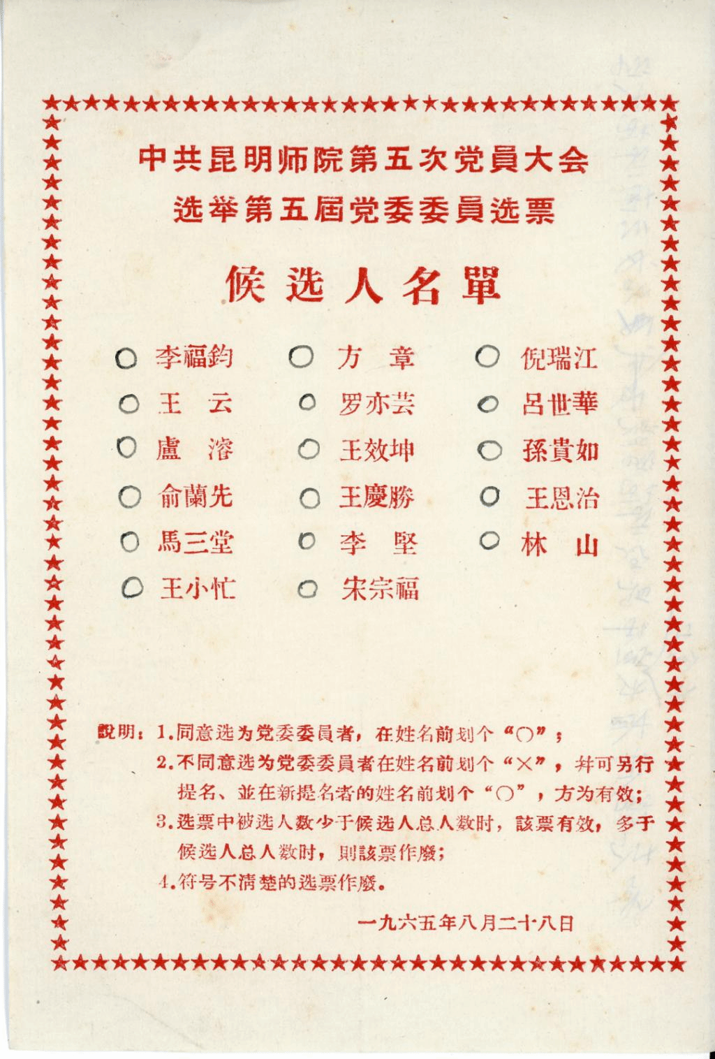 中共昆明师院第五次党员大会选举第五届党委委员选票