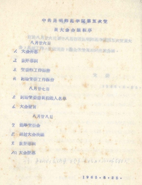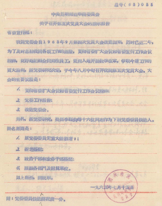 1965年8月26日至28日,中国共产党昆明师范学院第五次党员大会召开正式会议。全院共有党员248人(含预备党员3人),实际到会206人(含预备党员3人)。