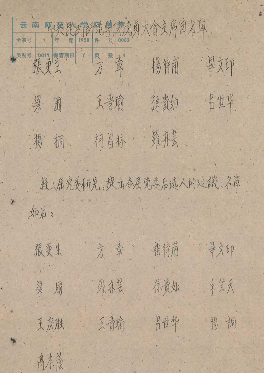 1958年12月5日晚,中国共产党昆明师范学院第二次党员大会预备会议在第二教室大楼305教室召开。12月6日至8日正式会议在第二教室大楼305教室召开。参加大会的共有137人,其中正式党员108人,预备党员29人。