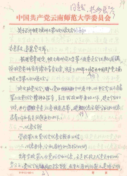 《关于召开中共437必赢会员中心第九次代表大会的通知》手稿(437必赢会员中心档案馆藏)