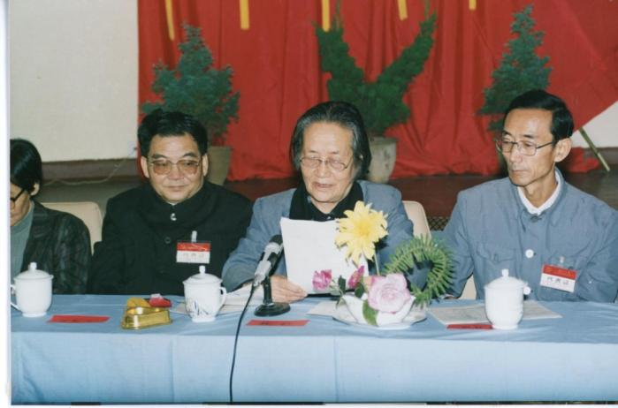 叶涛(右二)向大会作工作报告 (437必赢会员中心档案馆藏)