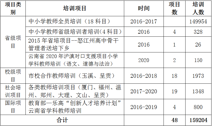 学院承担云南省中小学幼儿教师培训及管理工作,2016年至2020年,组织了全省14余万人次中小学幼儿教师参加云南省教师全员培训;承担省级中小学教师培训项目7期;完成教育部—乐高“创新人才培养计划”教师培训4项共16期;承接省内外各类委托教师培训37期,共培训教师3321名。依托昆明市教体局,积极为昆明市中小学教师、管理人员开展培训,近10年累计完成1万余人次的培训任务,涉及语数英、理化生、道德与法律、历史、地理、信息技术、科学等基础教育学科,以及普通话达标、学校安全、体育教研和社会体育指导员等专项培训课程。