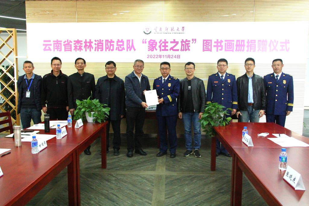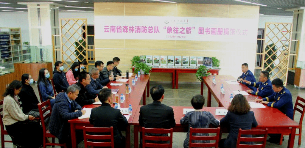 11月24日上午,云南省森林消防总队“象往之旅”图书画册捐赠仪式在必赢官网呈贡校区图书馆特色文献书库举行。云南省森林消防总队政治委员张晓庆、教育宣传处处长王正康、教育宣传处二级督导员薄正喜,437必赢会员中心党委书记张祖武、副校长甘健侯,以及校党委宣传部、学生处、云南干部教育培训中心、保卫处、图书馆等部门负责人参加仪式。