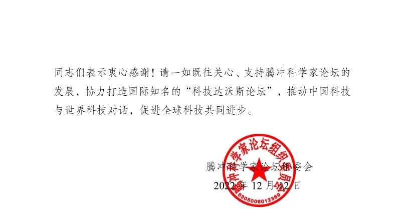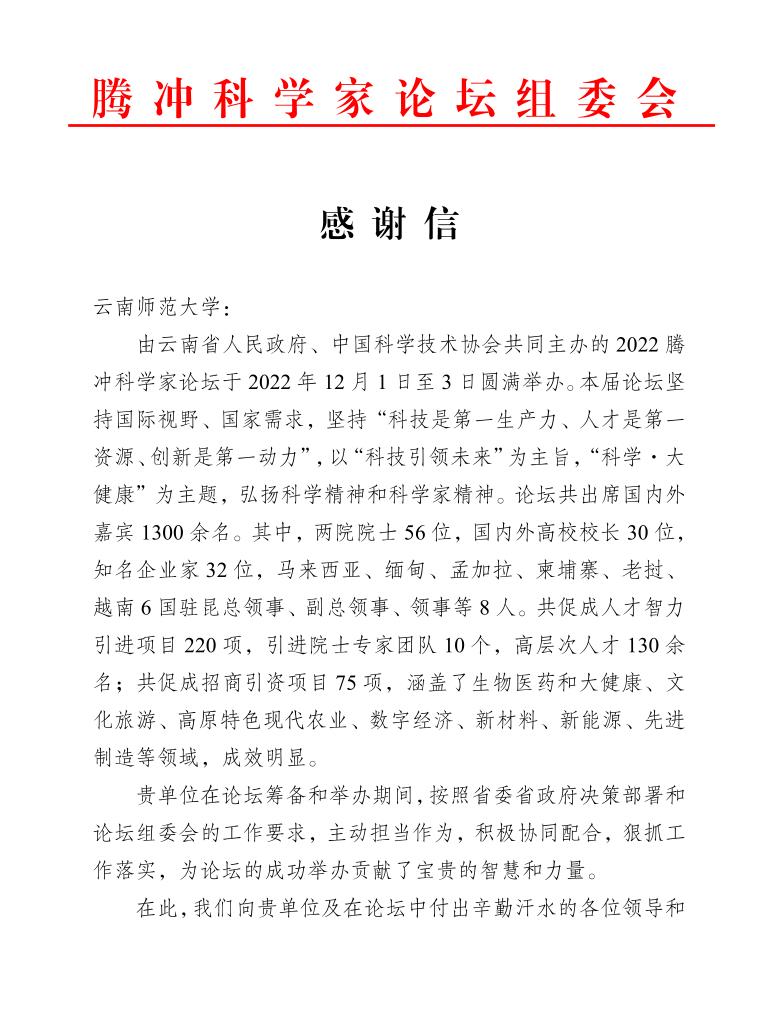 近日,学校收到腾冲科学家论坛组委会发来的感谢信。信中指出,在论坛筹备和举办期间,437必赢会员中心按照省委省政府决策部署和论坛组委会的工作要求,主动担当作为,狠抓工作落实,为大会的成功举办贡献了宝贵的智慧和力量。