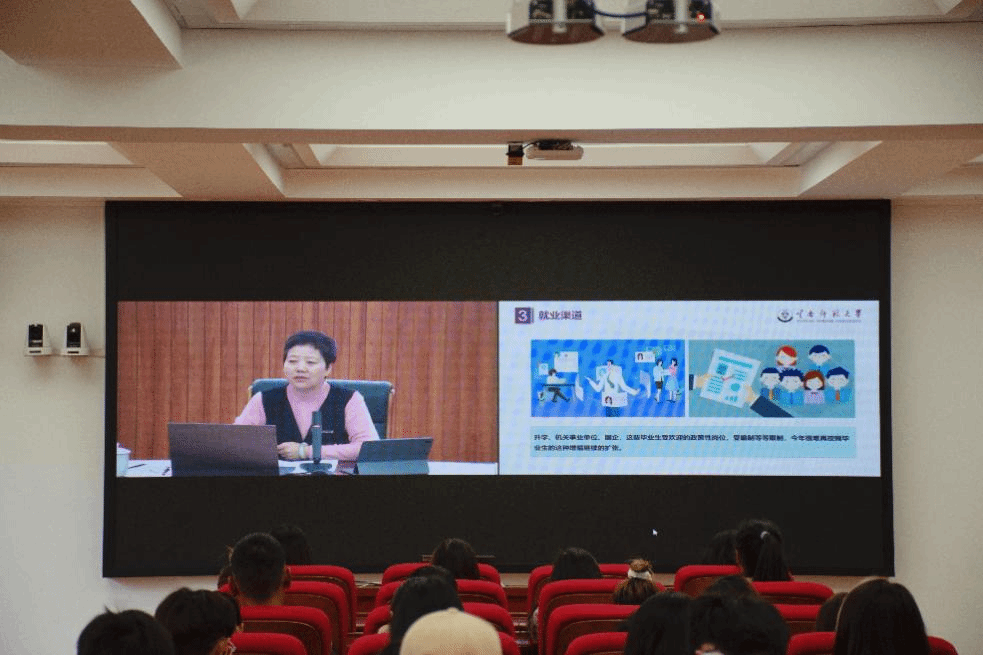 随后,李红以就业创业工作的经验角度出发,从就业形势、就业准备、就业权益、就业期待、就业心态等方面为全体毕业生做了详细的分析,给毕业生上了一堂兼具针对性、指导性和操作性的就业指导课。