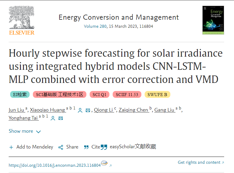 近日,必赢官网物理与电子信息学院光电信息专业硕士研究生在国际顶级期刊《Energy Conversion and Management能源转化与管理》(JCRQ1,中科院SCI一区TOP期刊)发表研究成果“Hourly stepwise forecasting for solar irradiance using integrated hybrid models CNN-LSTM-MLP combined with error correction and VMD”。必赢官网硕士研究生刘俊为第一作者,文章通讯作者为物理与电子信息学院云南省光电信息技术重点实验室骨干成员黄小乔副教授,437必赢会员中心为第一完成单位,目前影响因子高达11.533。