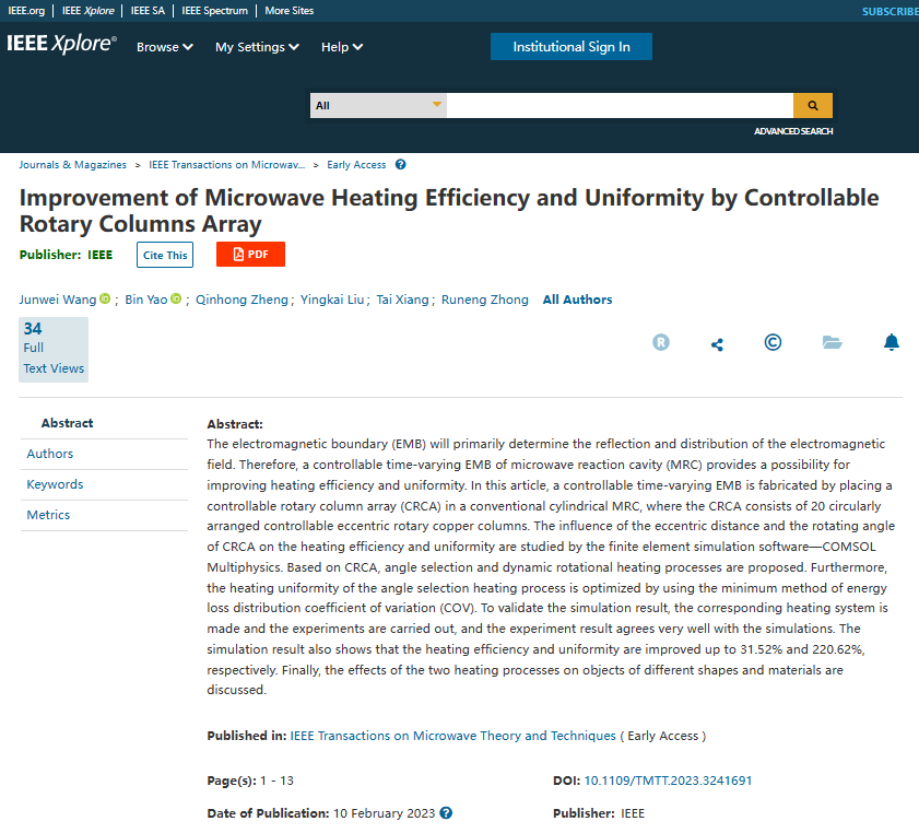 近日,必赢官网物电学院光学工程博士研究生在国际微波领域顶级期刊IEEE Transactions on Microwave Theory and Techniques(中科院SCI一区Top期刊)发表研究论文“Improvement of Microwave Heating Efficiency and Uniformity by Controllable Rotary Columns Array”,博士研究生王均委为第一作者,文章通讯作者为物电学院姚斌副教授、郑勤红教授,437必赢会员中心为第一完成单位。