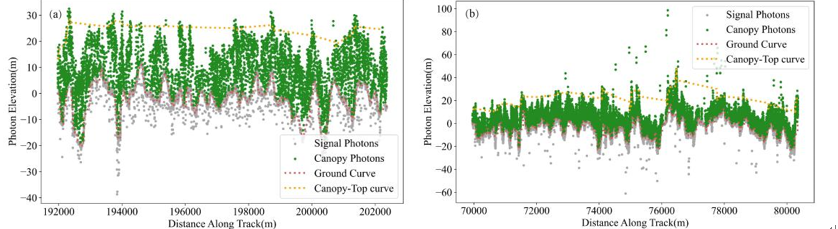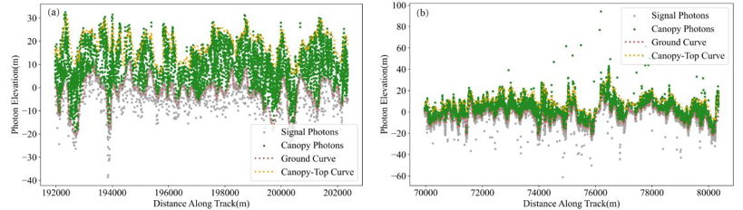 图2. 基于ICESat-2官方算法的地面-冠层光子点云分类结果。图2(a)为低信噪比场景下分类结果,图2(b)为高信噪比场景下的分类结果。