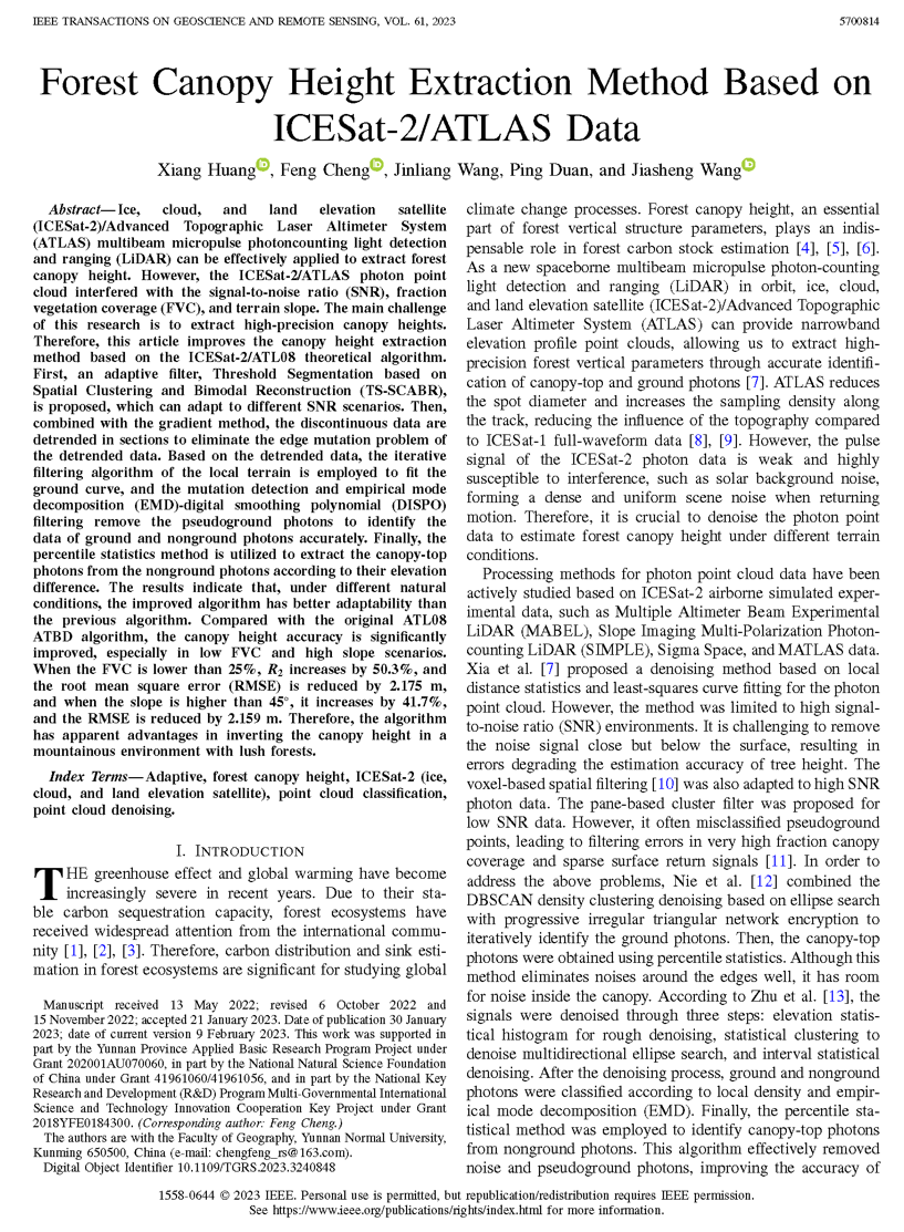 近日,遥感领域国际顶级期刊《IEEE Transactions on Geoscience and Remote Sensing(IEEE TGRS)》在线刊发了必赢官网地理学部本科生科研训练项目研究成果——Forest Canopy Height Extraction Method Based on Icesat-2/Atlas Data。IEEE TGRS是IEEE地球科学与遥感技术协会(GRSS)会刊,在遥感技术和地球科学领域具有较高影响力,是中科院一区TOP期刊,影响因子为8.125。论文第一作者时为地理学部2018级地理信息科学专业学生黄祥(现为地理学部2022级地图学与地理信息系统专业硕士研究生),通讯作者为地理学部程峰老师。
