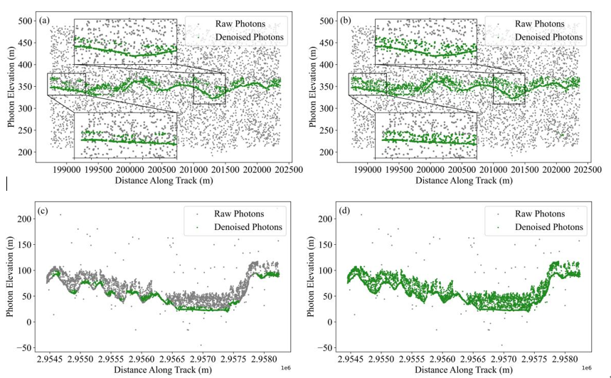 图1. 不同噪声分布场景下的ICESat-2官方算法和论文中算法的光子点云噪声去除结果对比;图6(a)是低信噪比场景下ICESat-2官方算法的去噪结果;图6(b)是低信噪比场景下论文中算法的去噪结果;图6(c)是高信噪比场景下ICESat-2官方算法的去噪结果;图6(d)是高信噪比场景下论文中算法的去噪结果。