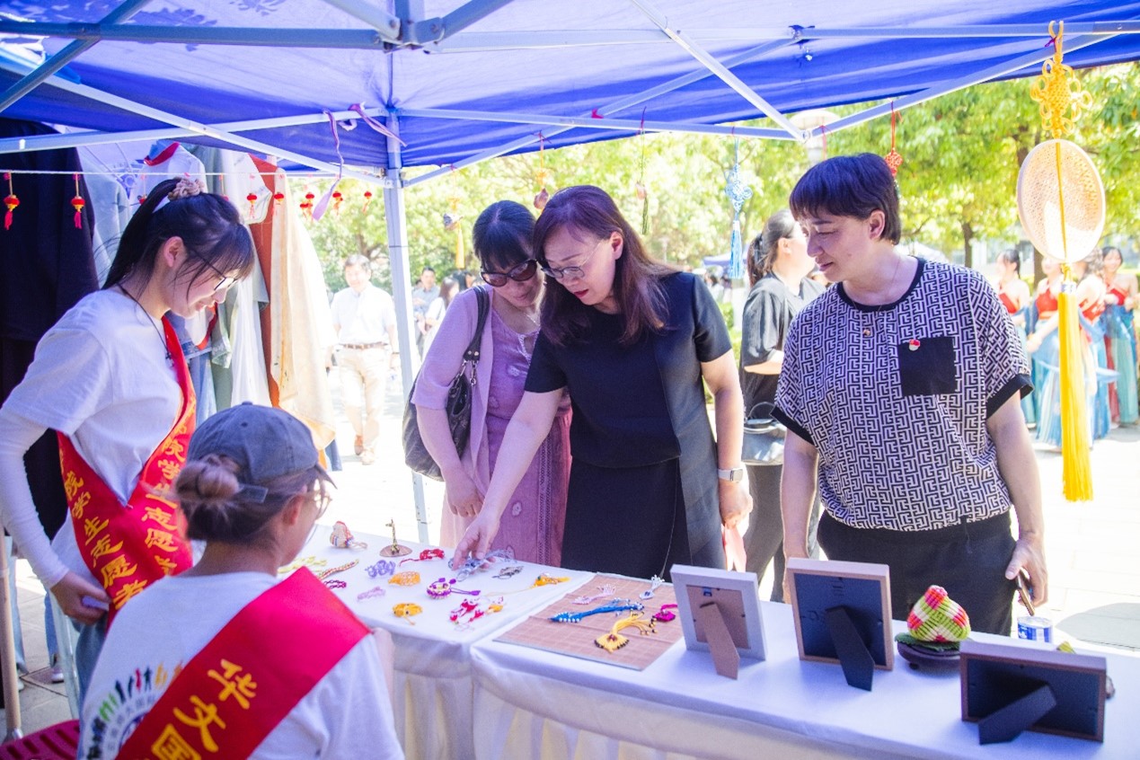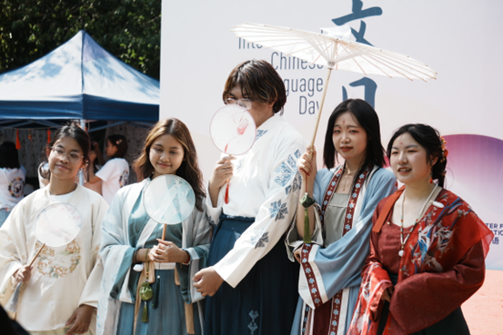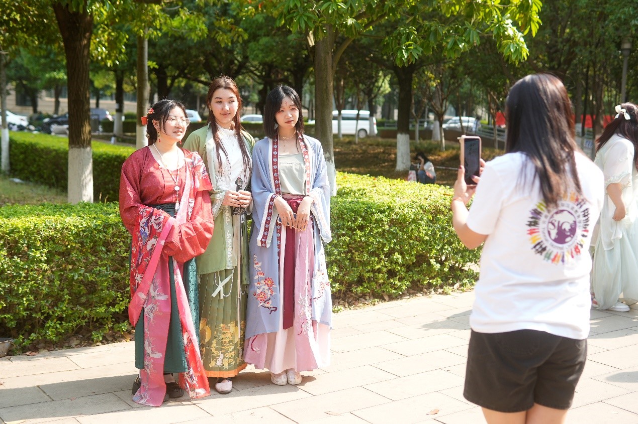 在汉服体验活动点,来自老挝、泰国等国家的留学生争先恐后地穿上精美的汉服,华文学院的同学一边帮体验者穿戴发饰,一边普及关于汉服的小知识。