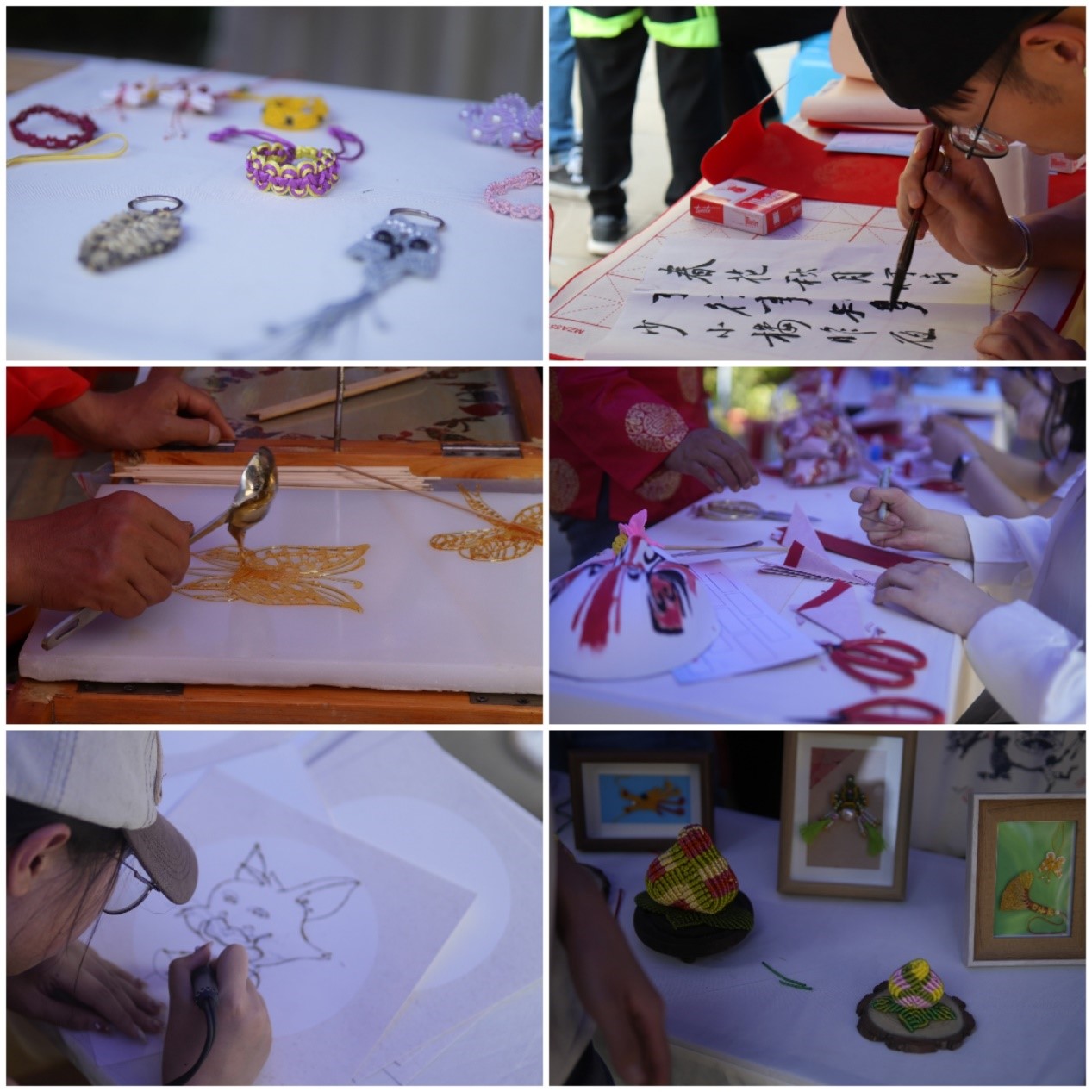 在中华才艺游园活动中,同学们的参与热情远胜于炎炎烈日。“射艺”“武术”“糖画”“编结”“面塑”“传拓”“烙画”“剪纸”等8项活动如火如荼地开展着。