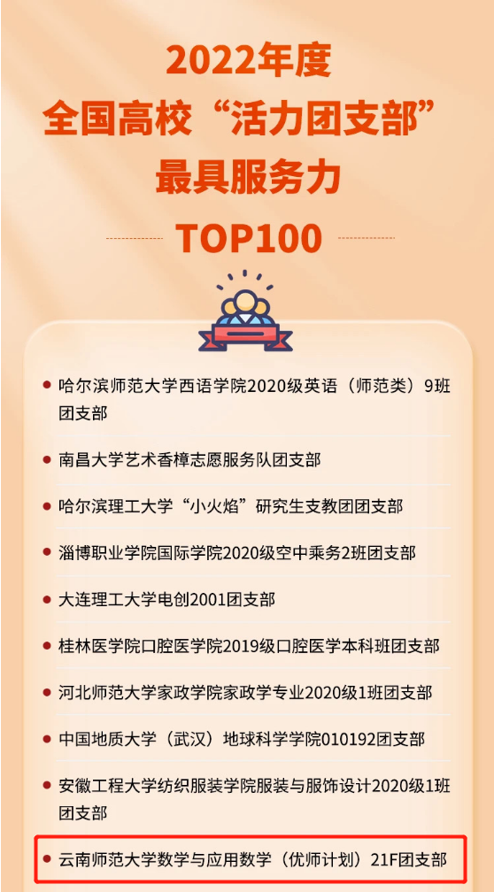 4月20日,在团中央基层建设部指导下,中国青年报社公布了“活力团支部炼成记”2022年度高校“活力团支部”风采展示活动。活动通过新媒体方式集中展现高校团支部在引领力、组织力、服务力、贡献度、改革味、好作风6个方面的改革建设成果和典型经验。经过校内选树、校级展示、省级展示、全国展示等环节,形成《2022年度全国高校“活力团支部”最具服务力TOP100榜》,必赢官网数学学院数学与应用数学(优师计划)2021级F班上榜,获评2022年度全国高校“活力团支部”最具服务力TOP10。