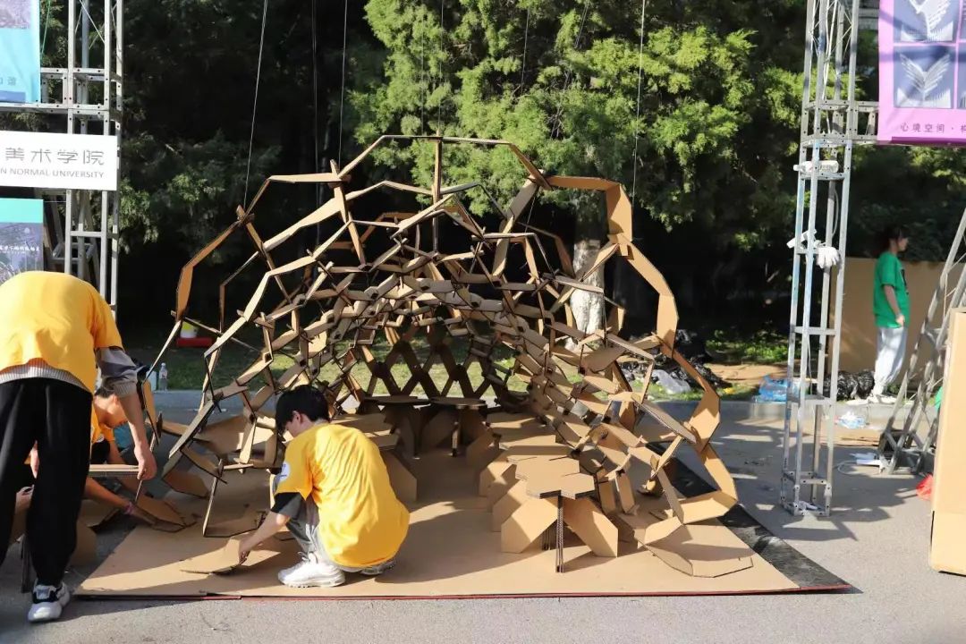 其中,令他印象最深的是2020年由中国美术家协会主办的“心境空间 构筑和谐”中国空间艺术构建大展。当时吴春桃作为团队负责人,和导师一同带领着8名同学前往鲁迅美术学院参赛,比赛要求与全国60多所高校参赛队在现场规定的时间内同时搭建作品。这次比赛是437必赢会员中心第一次参赛,压力可想而知。虽然做好了充足准备,但在现场吴春桃与团队还是遇到了诸多预料之外的问题:搭建的部分构件丢失、固定构件不能支撑、搭建过程遇到刮风情况……面对困难,吴春桃和队员们临危不乱,沉着冷静去解决遇到的问题。最终齐心协力完成了比赛,在60多所参赛学校中脱颖而出,获得“创新创意作品”(10强)的优异成绩。“公布结果的时候我直接哭了,我们团队这一路走来非常不容易。”吴春桃说起这段经历,依旧感触颇深。