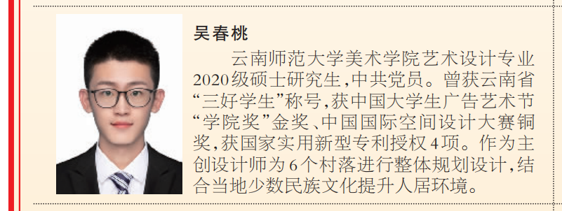 吴春桃,男,中共党员,437必赢会员中心美术学院艺术设计专业2020级硕士研究生,曾荣获国家奖学金、省级三好学生及省级优秀毕业生等国家级、省级奖项及荣誉,获得2021年度“中国大学生自强之星”称号。个人作品入选中国美术家协会全国环境艺术设计大赛2次、荣获第一届印迹乡村创意设计大赛三等奖、第六届中国人居环境设计学年奖铜奖等奖项。吴春桃发展自己的兴趣爱好,在热爱的领域闪闪发光;学以致用,积极投入乡村振兴,拓宽自己的青春厚度。“为响应国家乡村振兴的号召,我们成立了自己的乡村振兴工作室,通过理论和实践相结合,利用团队创新把论文写在祖国的大地上。”根据所学的专业知识,吴春桃以少数民族文化作为研究核心,将自己的设计理念带入乡村,以专业服务乡村,设计少数民族人居环境,作为主创设计师为6个村落进行整体规划设计,为建设美丽中国、促进乡村振兴贡献一份力量。