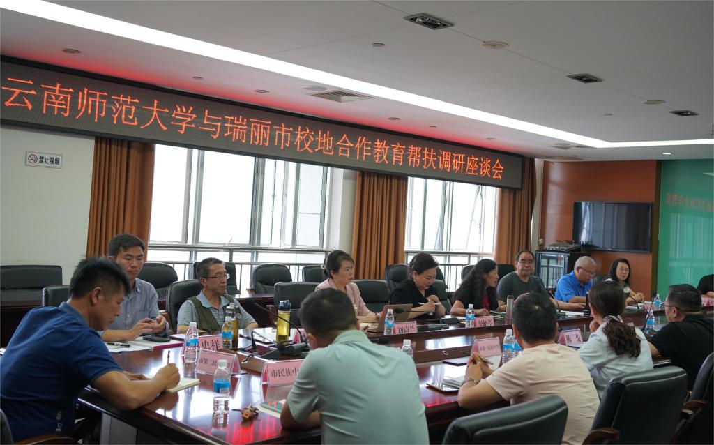 5月11日上午,调研组与瑞丽市政府召开了座谈会,瑞丽市政府、市教体局、瑞丽市初高中学校领导及相关负责人参加会议。瑞丽市教体局局长陈俊对瑞丽市教育发展的基本情况进行了介绍。副局长李淑宇就瑞丽市近三年中高考情况进行了汇报;听取汇报后,唐瑛介绍了此次调研的相关情况。王朝训介绍了云南师大与梁河一中开展校地合作教育帮扶的“梁河模式”。李幼芹交流了实验中学开展教育帮扶工作的经验和做法;瑞丽市与会初、高中校长结合本校情况,就教学质量提升的措施、亮点、存在困难问题及下一步工作打算作了交流探讨。
