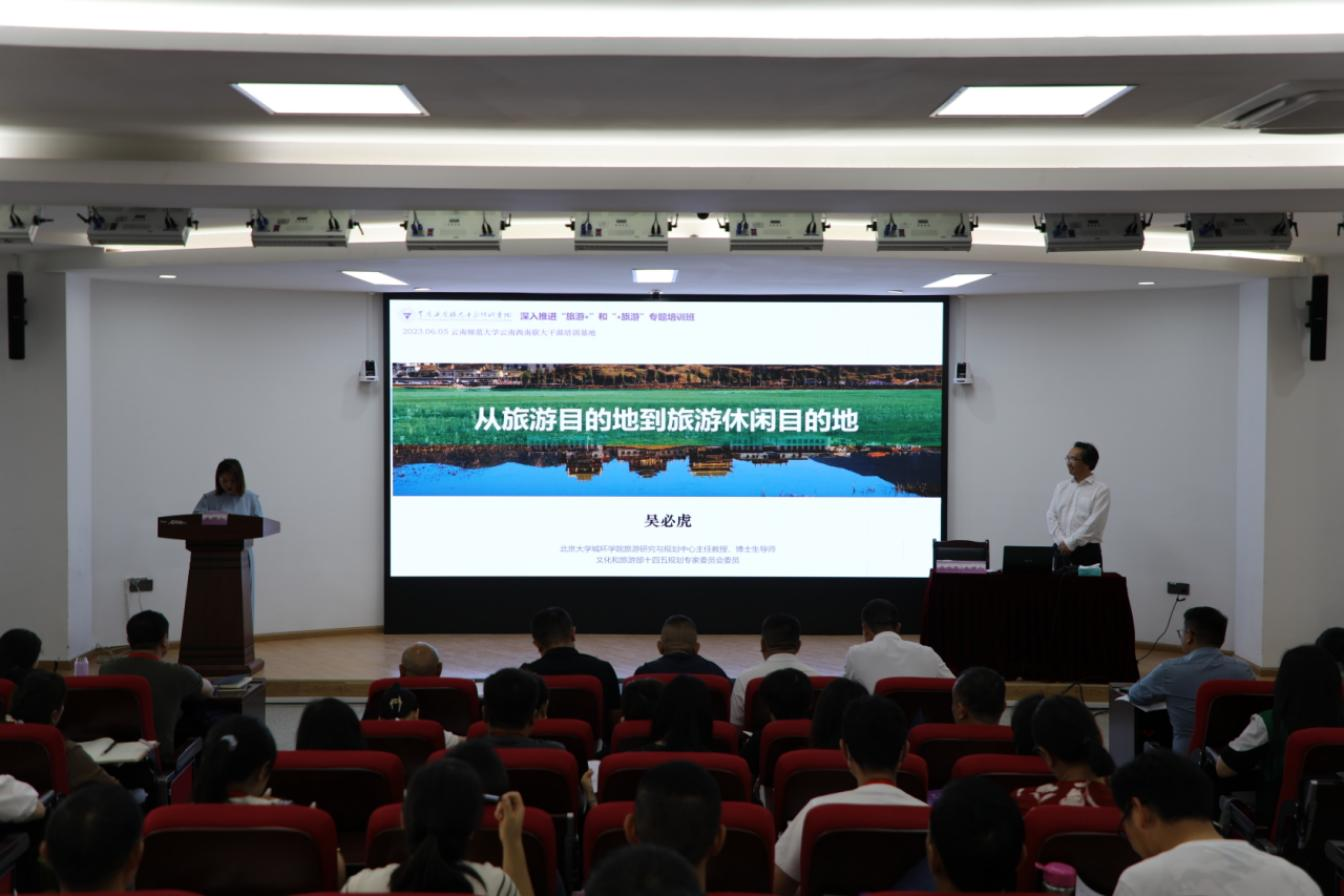 开班仪式结束后,北京大学城环学院旅游研究与规划中心主任、博士生导师,文化和旅游部“十四五”规划专家委员会委员吴必虎教授作了题为《从旅游目的地到旅游休闲目的地》的讲座。吴必虎从旅游目的地vs旅游休闲目的地、适应休闲度假时代的政策评估与创新、文旅深度融合与全面乡村振兴、云南旅游休闲目的地省建设与休闲度假产品开发等四个方面,深入浅出,内容丰富,为大家做好文旅深度融合,培育文化和旅游融合发展新业态方面提供了有益的思考和借鉴。