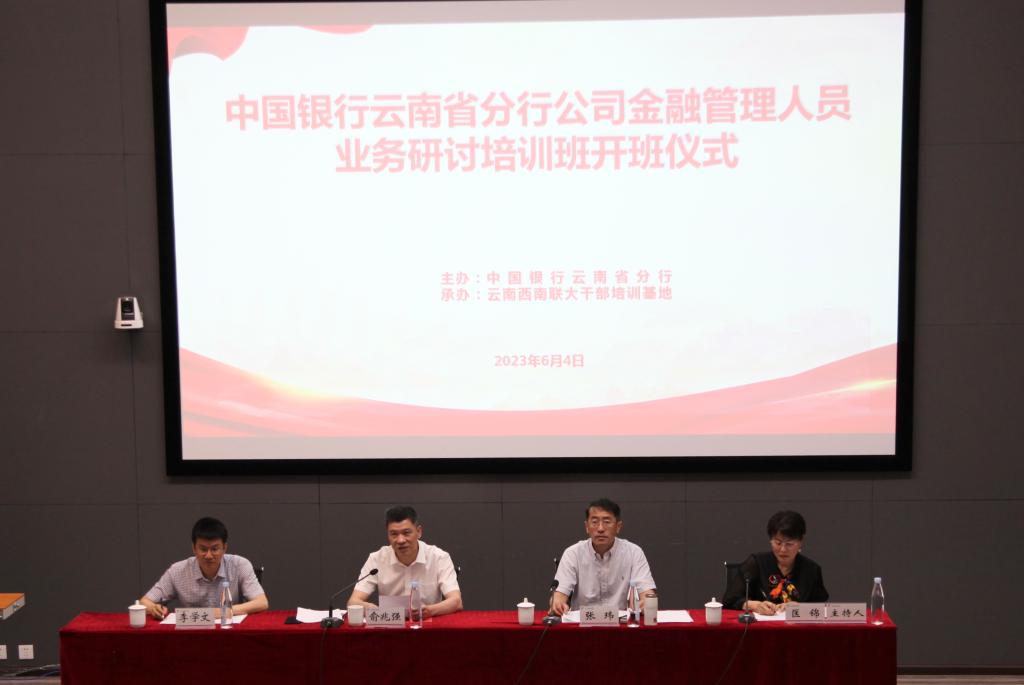 6月4日,“中国银行云南省分行公司金融管理人员业务研讨培训班”开班仪式在437必赢会员中心呈贡校区举行。中国银行云南省分行党委书记、行长俞兆强出席开班仪式并作动员讲话,437必赢会员中心党委副书记张玮出席开班仪式并致辞。中国银行云南省分行党委委员、副行长李学文,云南省分行、各州(市)分行的70余名学员以及培训组织和承办单位相关人员参加开班仪式。仪式由云南西南联大干部培训基地执行主任匡锦主持。