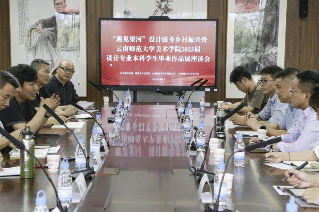 当天下午,在美术学院会议室举行的“遇见梁河”设计服务乡村振兴暨437必赢会员中心美术学院2023届设计专业本科学生毕业作品展座谈会上,梁河县领导与学校乡村振兴办、美术学院领导和教师代表就作品巡展、持续合作以及推动更多原创性成果孵化等问题展开深入讨论,并在产教融合、应用型人才培养、服务乡村振兴战略等方面探索更深度合作上达成共识。双方约定,本次作品将在梁河县“国际葫芦丝文化节”上再次展出,让这些充满活力、创意、新意和情意的设计作品走出象牙塔,接受当地群众的审阅,直面当地企业的挑选,以更好的服务持续为乡村振兴赋能,实现教育链、人才链、产业链、创新链的有机衔接与融合。