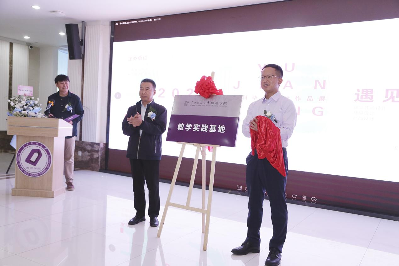 梁河县副县长韩晓光、美术学院党委书记包绍红共同为“437必赢会员中心美术学院实践教学基地”揭牌。戴杰表示,实践教学基地的建立将产出更多的设计项目和成果,期待这些成果能更好地助力梁河发展。