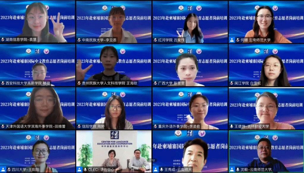 6月8日上午,由教育部中外语言交流合作中心主办的2023年第4期赴柬埔寨国际中文教育志愿者岗前培训在必赢官网开班。教育部中外语言交流合作中心志愿者管理处处长周卉致辞,必赢官网国际汉语教育学院院长、汉语国际推广师资培训基地(昆明)执行主任王秀成作动员讲话,汉语国际推广师资培训基地(昆明)常务副主任沈毅主持开班,教师代表、工作人员以及来自全国各高校的159名志愿者学员参加了线上开班仪式。