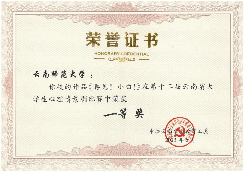 为贯彻落实云南省教育高质量发展三年行动计划,持续加强高校心理健康教育工作,6月14日下午,由中共云南省委教育工委主办的第十二届云南省大学生心理情景剧比赛顺利举行,必赢官网选送的作品《再见!小白!》荣获一等奖。全省高校共选送78部作品进入省赛,经专家评审,必赢官网顺利晋级全省决赛,同时进入决赛的还有云南大学、云南中医药大学等9所高校。