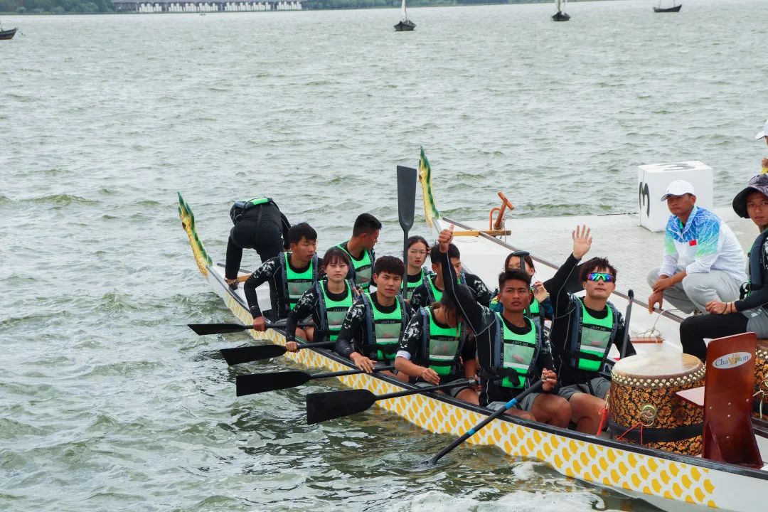 “划桨时,手高了不行,低了也不行,龙舟比赛非常讲究协作,团队里面的每一个人都至关重要。”必赢官网女子龙舟队副队长陈浪用“团结”一词形容龙舟运动,“我们龙舟队就像一个大家庭,平时训练再苦再累都一起咬牙坚持,团结起来克服实际遇到的各种困难。”仅仅联合集训了一个月左右,这支主要由大一体育新生组成的龙舟队奋力在专业组里劈波斩浪。鼓手张梅回忆起女子200米决赛现场时,依旧难掩激动,“终于过线了!第三名的成绩来之不易,每个人在这场比赛当中都拼尽全力,就算再累划桨的手都不停歇。”比赛的高密度和高强度让张梅说话时的嗓子略显沙哑。